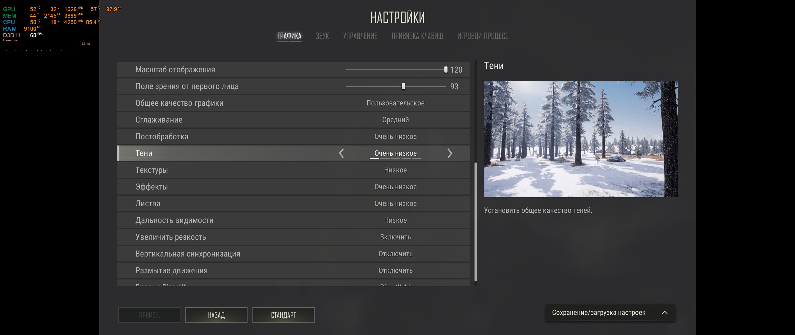 Настройки все минимум, кроме сглаживания на среднем и дальности прорисовки на среднем. Так же UPscale стоит на 120. Разрешение монитора у меня 2560x1080.