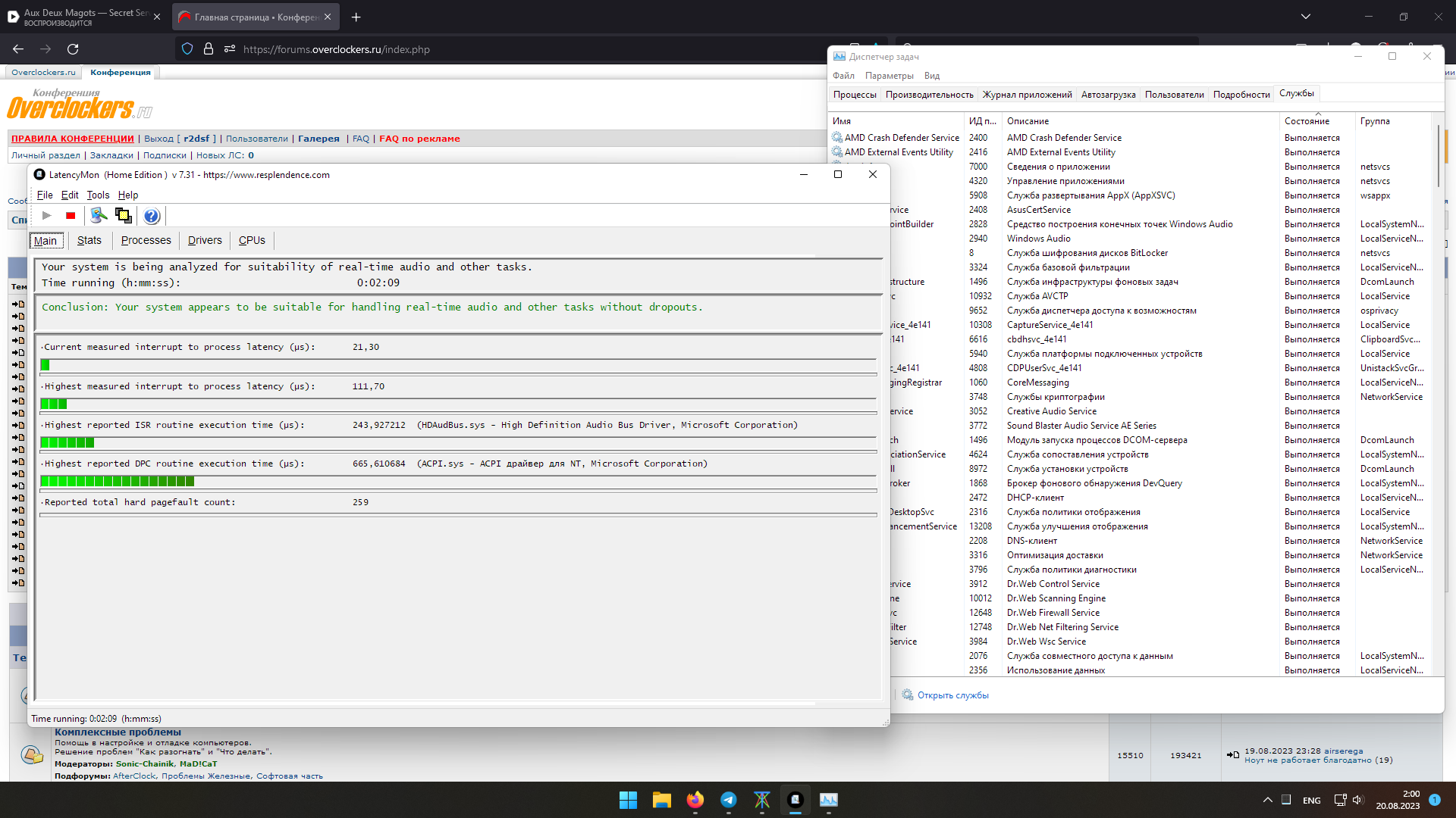 вот прям счас запустил в винде, и через минуту красным: Conclusion: Your system seems to be having difficulty handling real-time audio and other tasks. You may experience drop outs, clicks or pops due to buffer underruns. One problem may be related to power management, disable CPU throttling settings in Control Panel and BIOS setup. Check for BIOS updates.