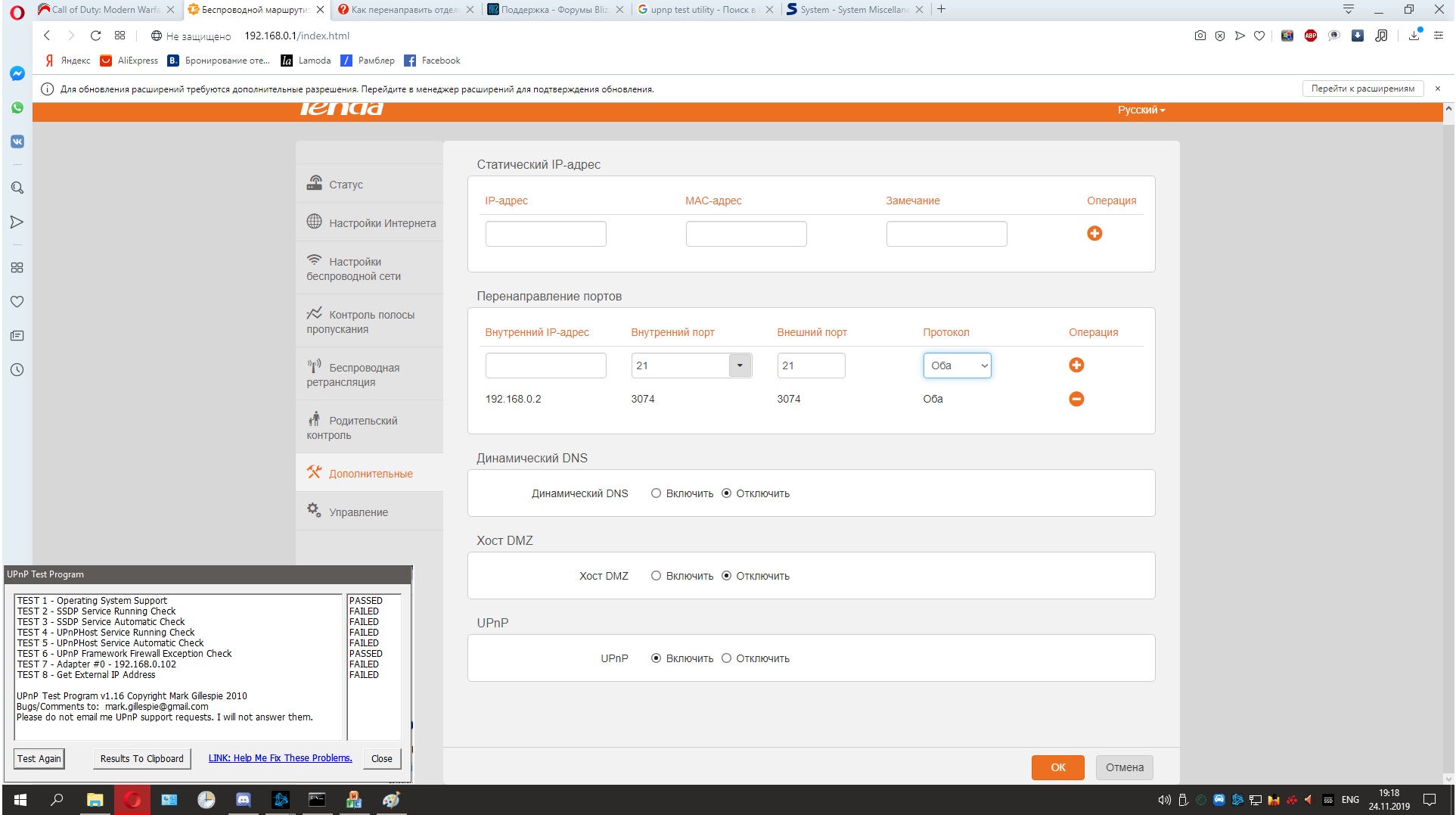 eRzZz ip свой закрасьте А так это все можно сделать passed, должно помочь, ну в старых код помогало(mw 2 3, БО) Но придется долго и нудно гуглить. Раньше прям в этой утилите перенаправляло на гайд что как делать, но теперь сайт недоступен. Сам я это все делал, но уже не вспомню что и как. По идее надо чтобы кто-то выложил такое же с открытым нат(только ип уберите свой ) - скорее всего не все настройки надо лопатить. upd. запускать надо от админа. У меня тест проходят первые 3 параметра