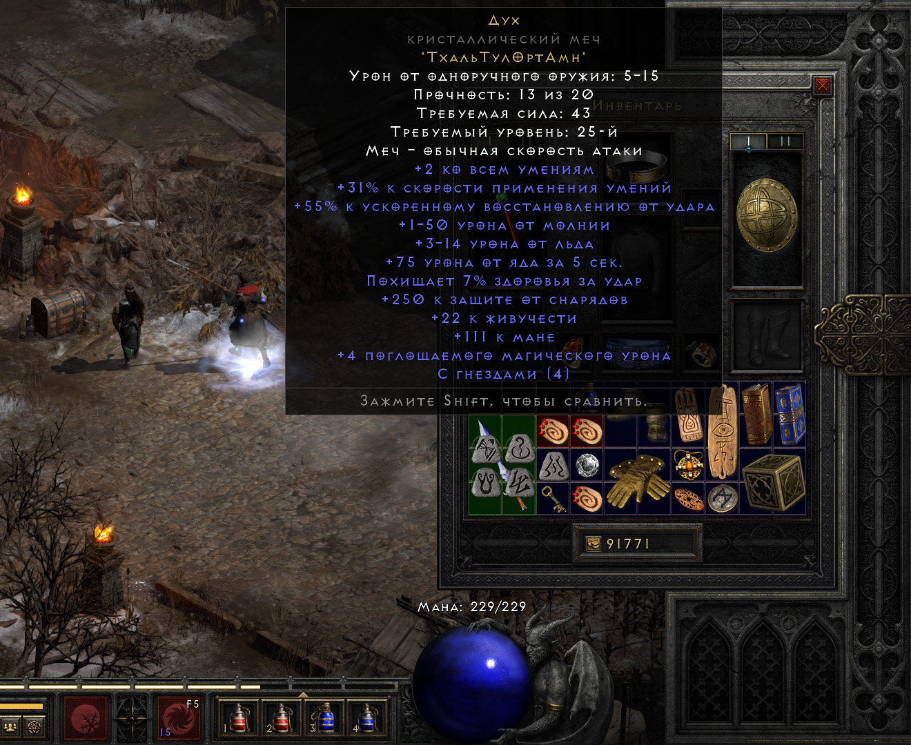 Меч фармишь на нормале 4-5 акт вроде (Broadsword, Crystal sword, Long sword). А щит под 4 дырки только в hell. Нужен Monarch. Дырки пробивать у Ларзука (1 квест 5 акт).