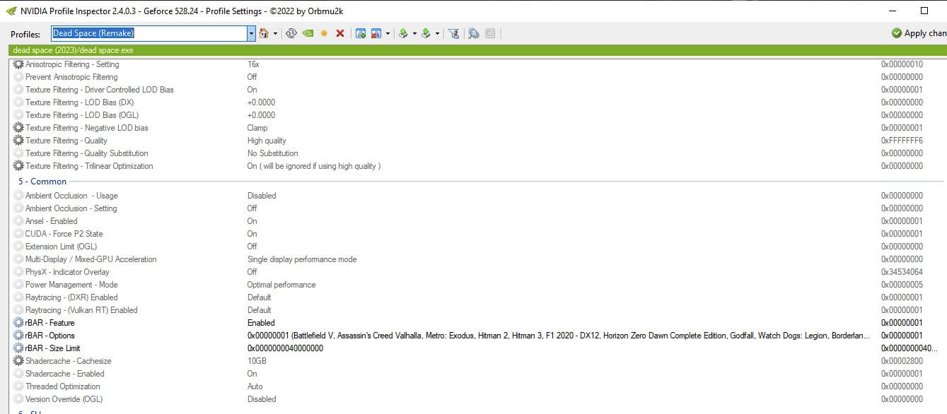 Функция PCI Resizable BAR может сильно повлиять на производительность Dead Space (перезагрузка 2023 года). sxKYLE на Reddit обнаружил, что его GeForce RTX 4080 «Ada» испытал значительный скачок производительности с 76 FPS до 111 FPS (+46%) с включенным изменяемым размером BAR. NVIDIA Profile Inspector использовался для включения изменяемого размера BAR для игры.
