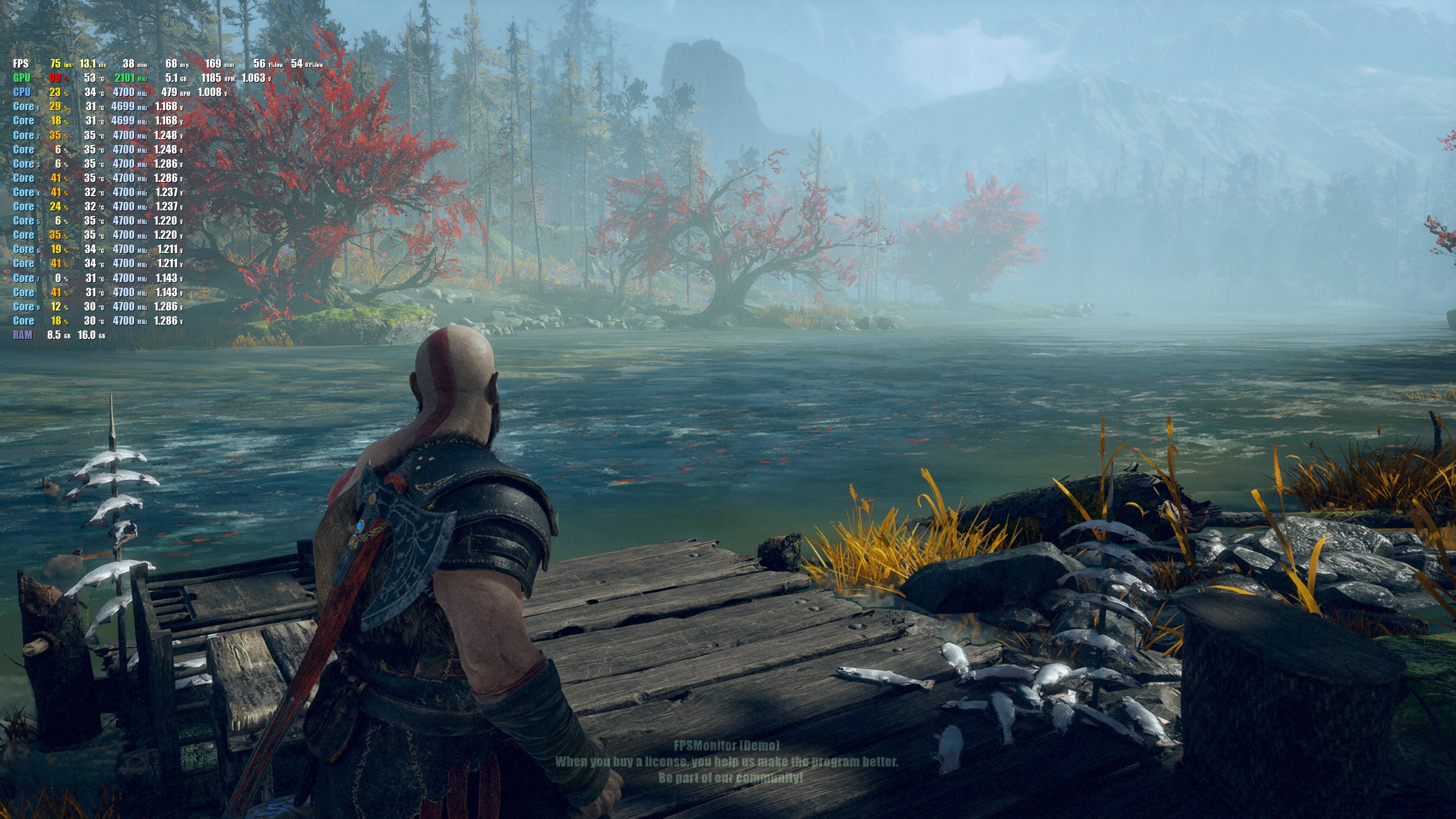 R5 3600, GTX 1080, 16 GB RAM 3800 в разрешении 2k с настройками средне - высокими 60-70 FPS. разницу в графоне на 2к разрешении между средними и высокими тоже не замечаю.