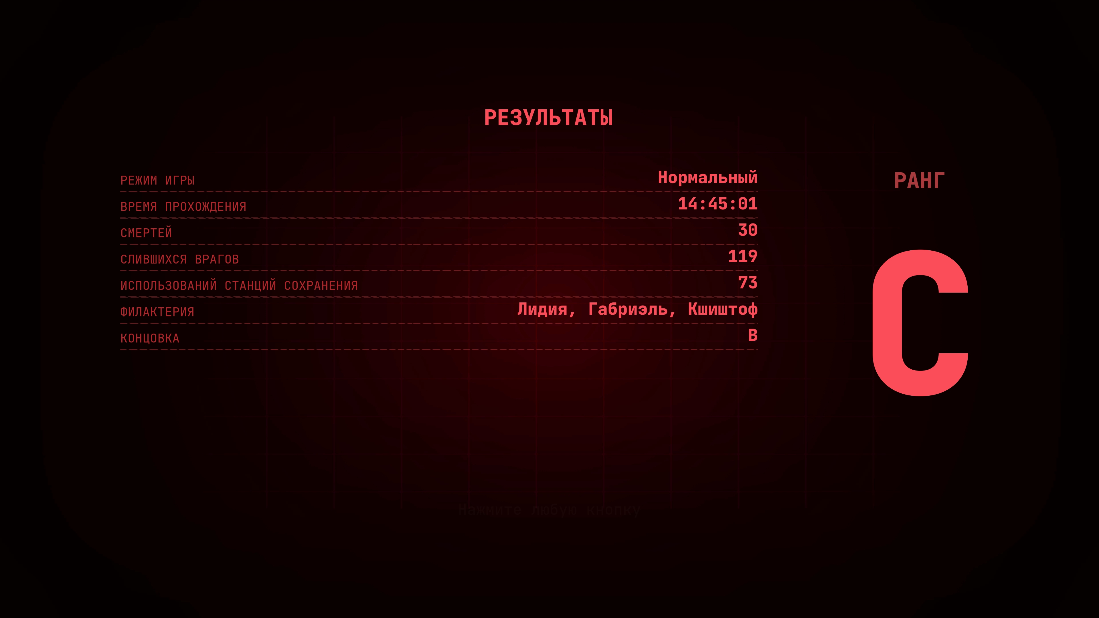 То же сегодня закончил, проходил не спеша, потратил около 20 часов, у меня вообще смертей 45, результат тот же самый - концовка "В", ранг "С", за всё прохождение был один баг на Аббатстве, пришлось переиграть с автосохранения (писал об этом выше), ты последнего босса "исследователя" с первого раза прошёл?, я только с третьего его одолел, прочный гад