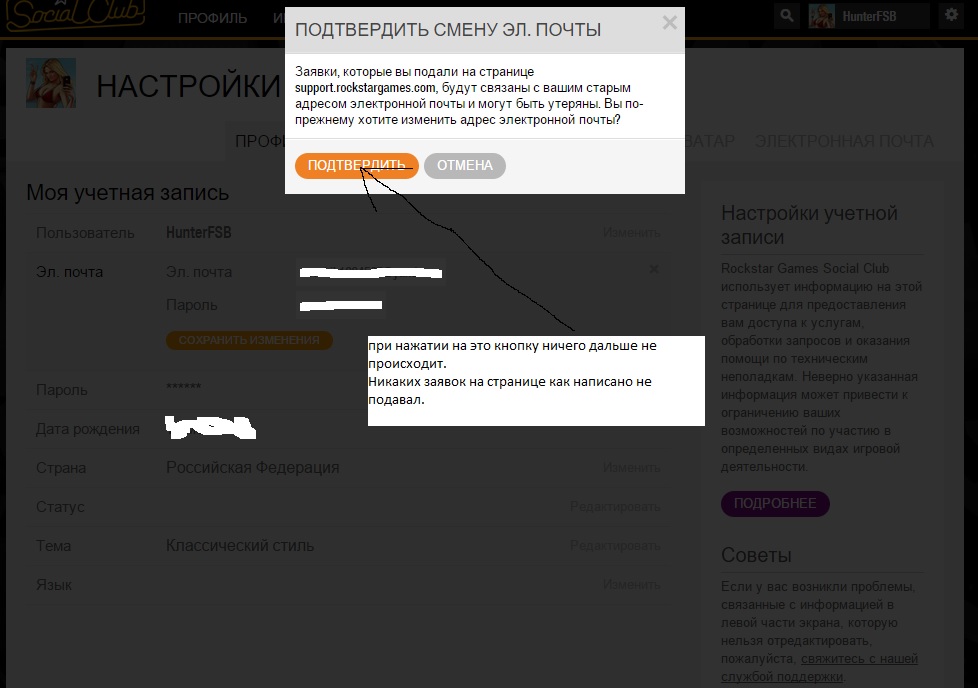 Gottex подскажите, не могу сменить почту в соушал клабе,указанную при регистрации первоначальной,т.е почту вбиваю,пароль,но применение ничео не меняет.