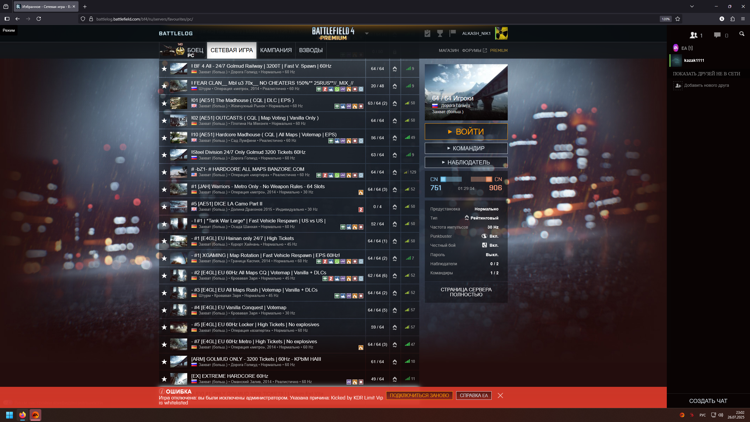 выкидывает с сервака, скорее всего заходит какой то "вип", и все, больше не зайти! хоть какой сервак выбирай, такая ошибка