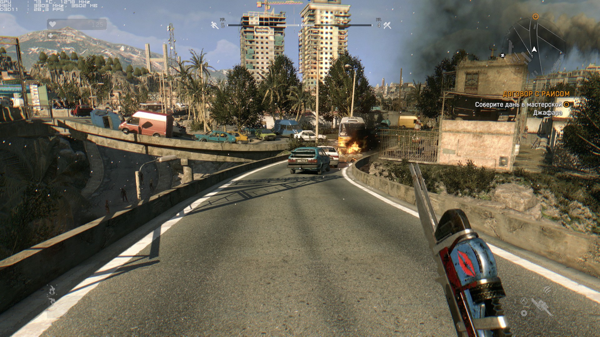 Skyrim+Mirrors Edge+Dead Island=Dying Light В принципе все эти перечисленные игры мне понравились. А эта коктейль какой-то. Респавн только не нравится. И даже на средних производительность хорошая. Только видео грузит на 60-70% со скачками редкими до 90% 1 ядро на 100%, второе на 70-80%, а третье на 60% грузится. Дистанцию вообще на минимум вырубил. Разницы не заметил.