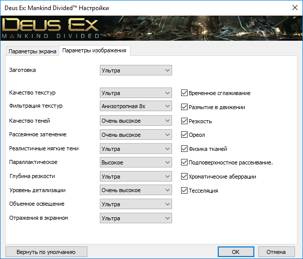 Настройка чувствительности мышки в игре - 1, 2. Настройка графики через SweetFX - ссылка Если у вас карта от AMD и есть микро фризы - выставите в профиле Deus Ex: Mankind Divided принудительно shader cache on. Он там по дефолту отключен (оригинал). Отключение видео вставок при запуске игры - ссылка