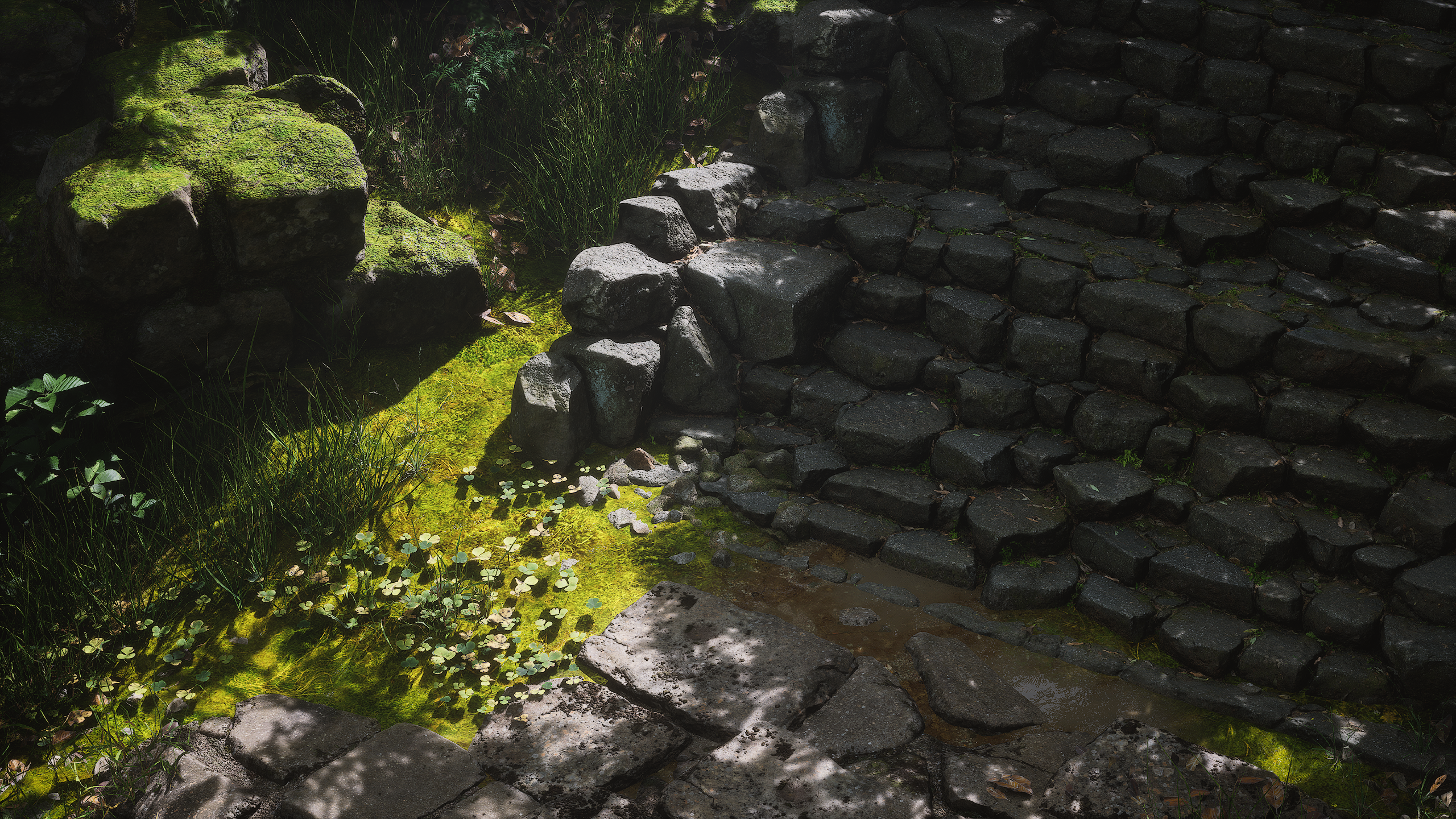 При рассмотрении мелких предметов, камней, в фото режиме конечно качество мелочей впечатляет. Схожее было в Hellblade2. Не помню ни одной игры на других движках со схожим качеством, что выдает UE5. Обратите внимание даже лужица между камнями внизу имеет какую то рябь\отражения.