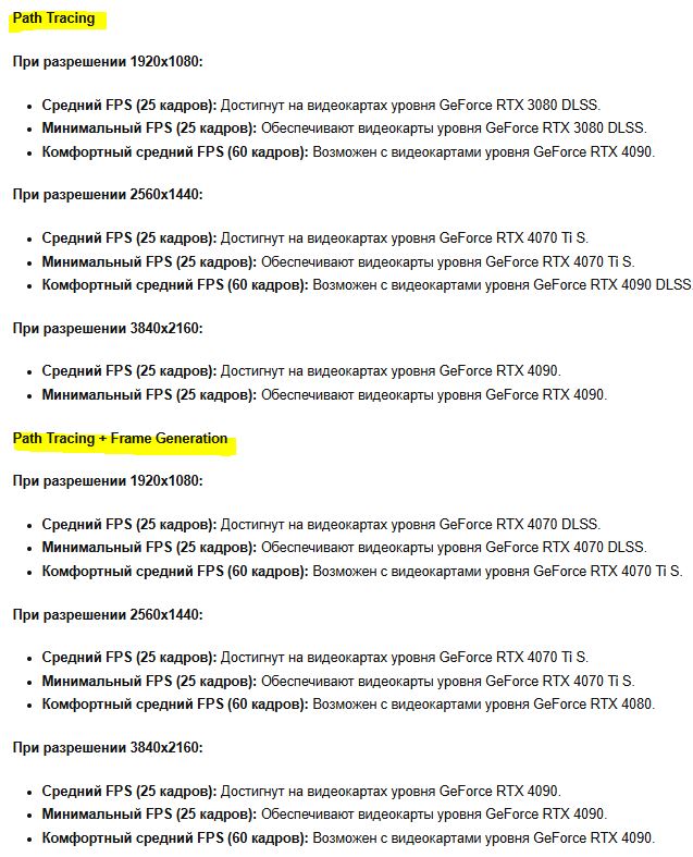 Минимальный порог вхождения для Path Tracing — видеокарты с объёмом видеопамяти не менее 12 ГБ. Однако даже в этом случае, для разрешения 1920x1080, требуется активное использование технологии апскейлинга DLSS в режиме качества. При этом стабильная работа не гарантируется: возможны частые вылеты и падения производительности.