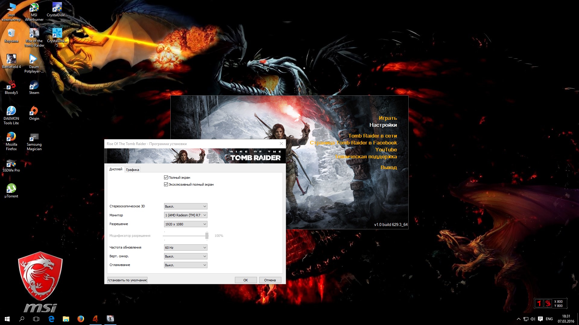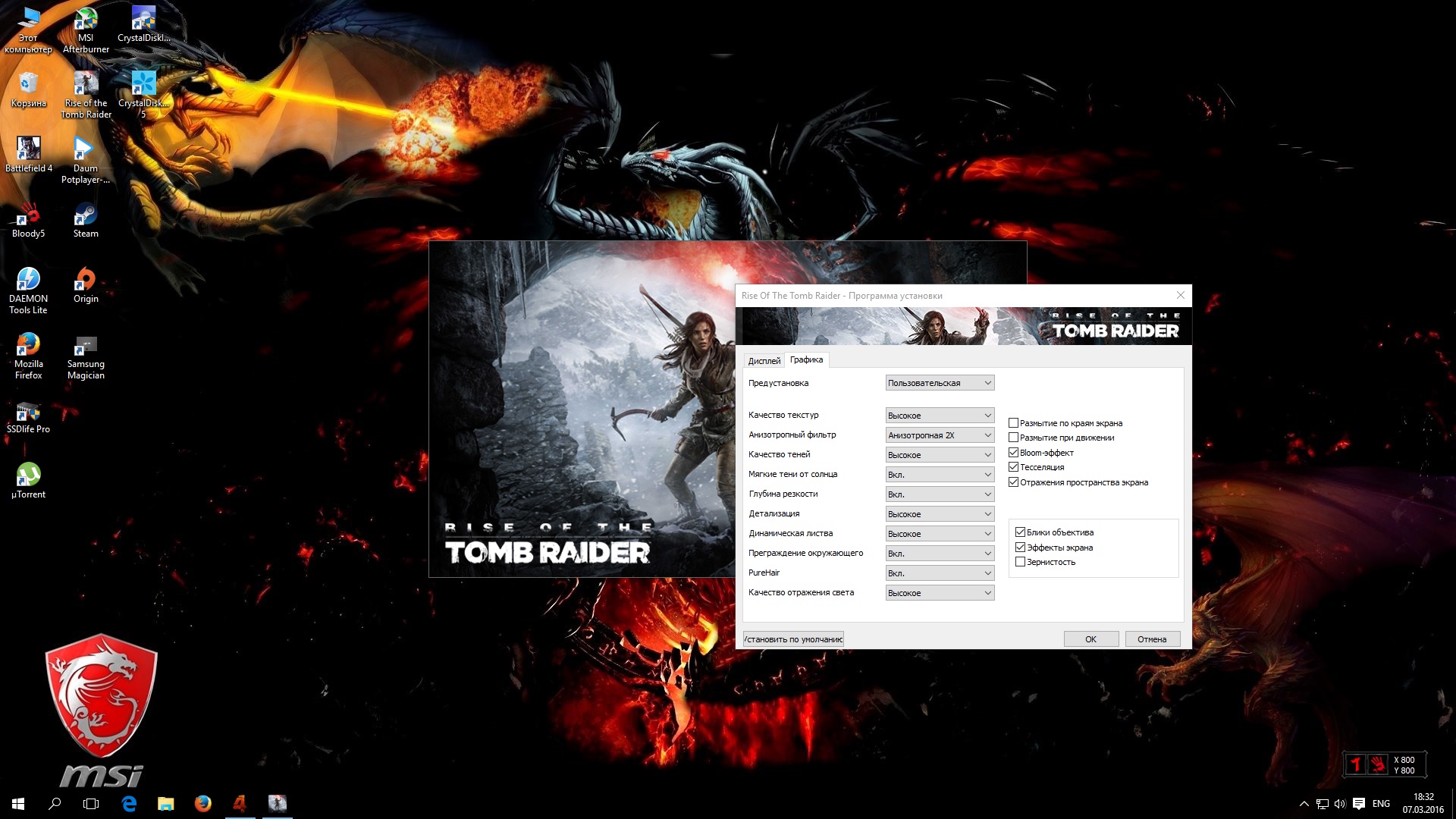 Фесс321 А какие настройки? У меня как на скринах, при этом оперативки "кушает" в игре от 6 до 7 гигов, и файл подкачки от 8 до 9 Когда игра на hdd была установлена, то при таких настройках, даже в роликах фпс падал до 10. Сейчас установил игру на ssd, все намного лучше. Сейчас средний 30-40 фпс, в гробницах вообще больше 50