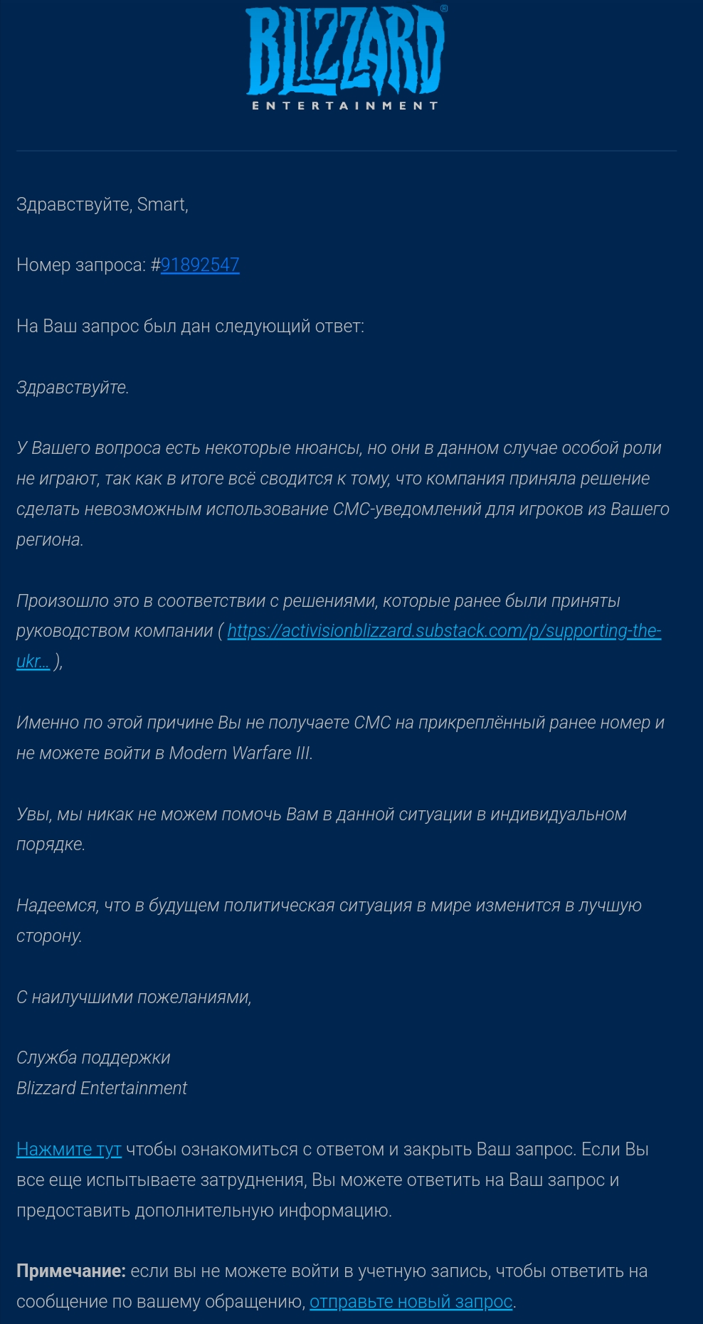 viziter Ну я об этом и писал выше, а возврат средств они сделать не хотят? За предзаказ MW2, запуск которого блокнули на релизе с ру аккаунтов, деньги возвращали, единственное в чем я им благодарен, что эти трансвеститы показали ещё тогда, одни из первых, своё русофобское рыло, после чего баттлнет был удален, хоть бы стим не занялся подобной хреновиной, а то будет вообще ахтунг...