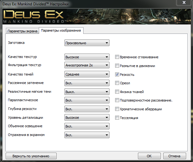 Настройка чувствительности мышки в игре - 1, 2. Настройка графики через SweetFX - ссылка Если у вас карта от AMD и есть микро фризы - выставите в профиле Deus Ex: Mankind Divided принудительно shader cache on. Он там по дефолту отключен (оригинал). Отключение видео вставок при запуске игры - ссылка