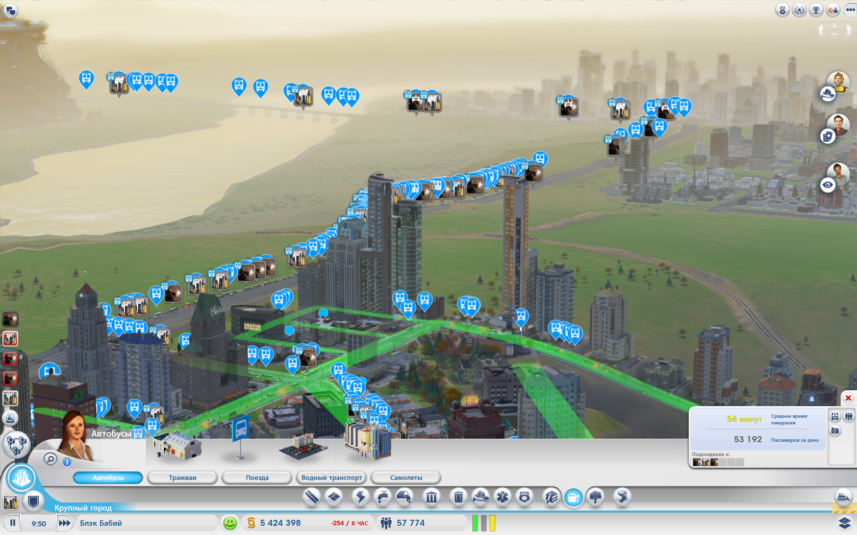 Nitey, есть вариант в котором пробки не особо душат: 2 автобусные станции (первая перестает справляться после 150к населения и толпы туристов), трамвайное депо с макс кол-вом трамваев, и самое главное - все перекрестки построить не в форме креста " + " а в форме " Т " чтобы пересекались максимум 3 дороги, а не 4. Пробки меньше, проблем тоже. Ну и само собой 3 тур.заманухи, парки и прочее. Вторсырья зато просто дохрена - 3 завода битком и еще думаю 4й строить. Сплавы уже надоело продавать и места на карте нету.