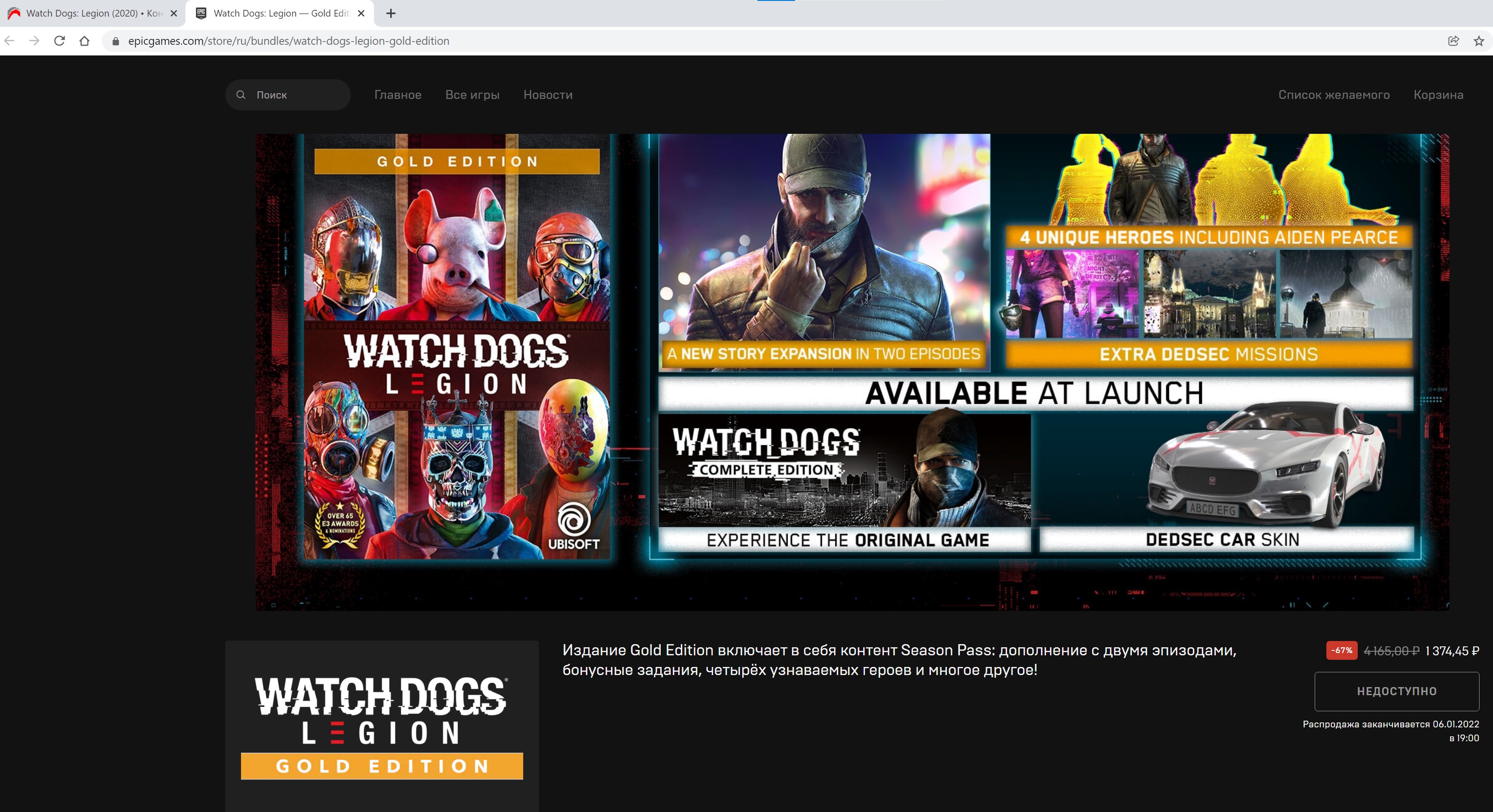 Сезонный абонемент включает в себя дополнение с 2 эпизодами и другой контент: бонусные задания, 4 персонажей с уникальными способностями, раскраску для машины Dedsec и доступ к Watch Dogs Complete Edition.