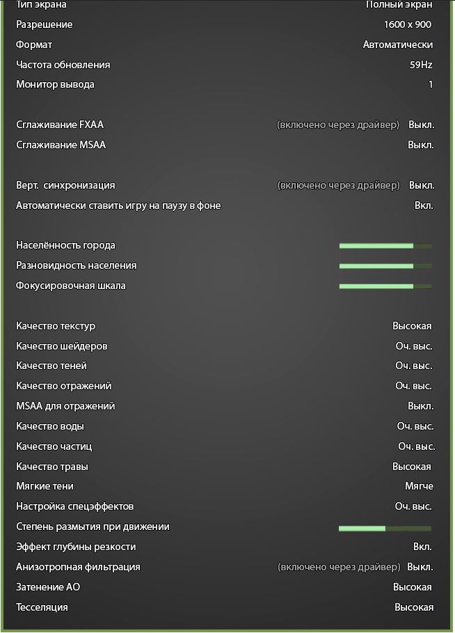 seebox ну я и говорю тут все на костылях,при моих настройках самая густая трава 61-66,город и остальное 80-120,и тут я даже не рыпаюсь ибо выключить все цифры,то даже и не заметно что там чет скачет и чет не дотягивает,единственное (опять мб в моем случае,мб еще у кого так) дабы все настройки работали корректно надо зайдя в игру свернуть/развернуть или же настроку переключить настройки спец эффектов(я так понял чтоб норм было надо переключать ту настройку,которая потом спрашивает вы уверены),ну костыли костыли чтож еще делать,выключаем цифирки ,кому надо переключаем настройку и нормально катаем,более не как