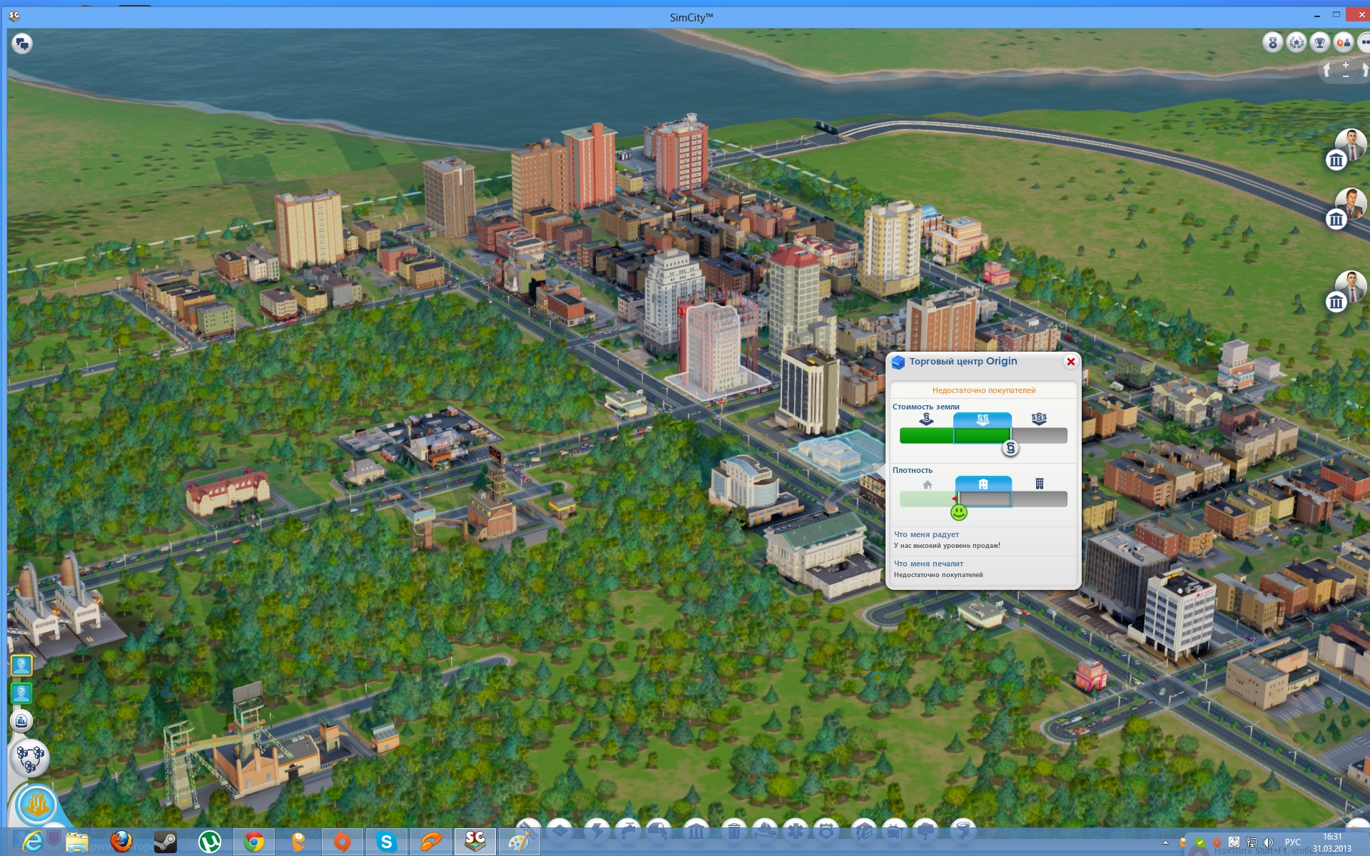 Q: Подскажите как плотность застройки поднять? A: Факторы, влияющие на плотность: службы, расстояние до магазина, продажи (количество покупателей) и состояние дорог (пробки). Сама дорога (простые, 2х и авеню дают возможность строиться высоткам, если факторы выше этому способствуют). А для каждого типа населния свои требованиям к: службам, магазинам и состонию дорог. (Сама стоимость земли регулируется парками - от $ до $$$).