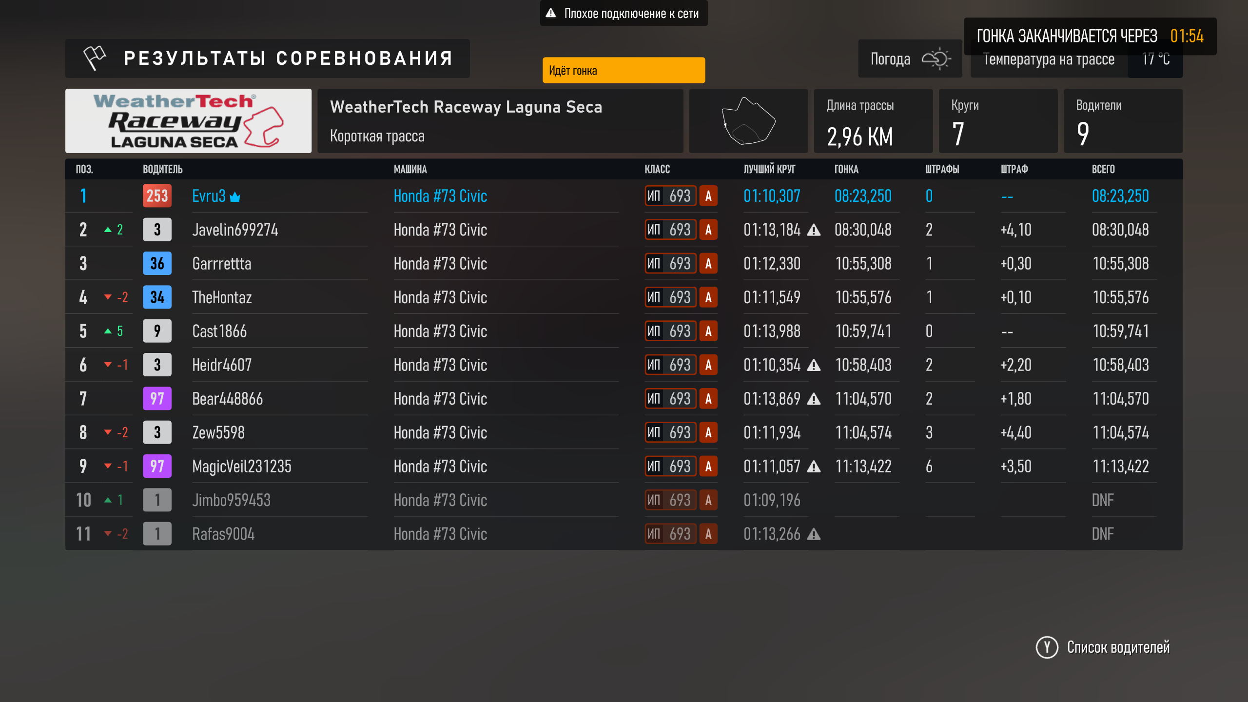 Зато офигенный резалт онлайн у меня получился, впервые, можно сказать Большой шлем. Без практики взял поул, успел на квалу за неск минут, стартовал первым и накручивал лучшие круги - победил