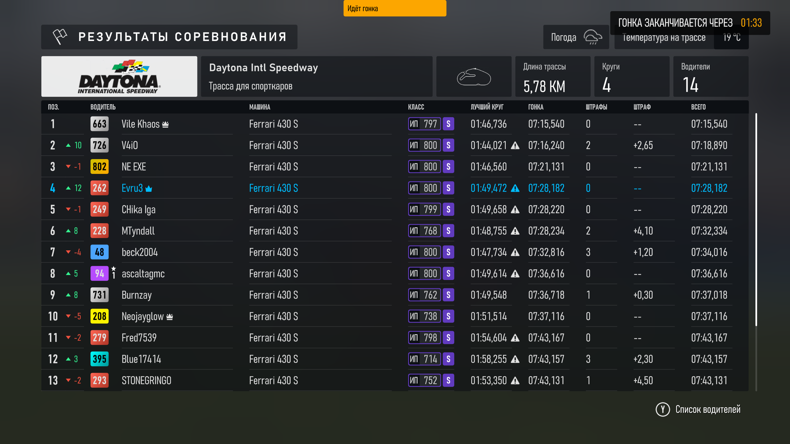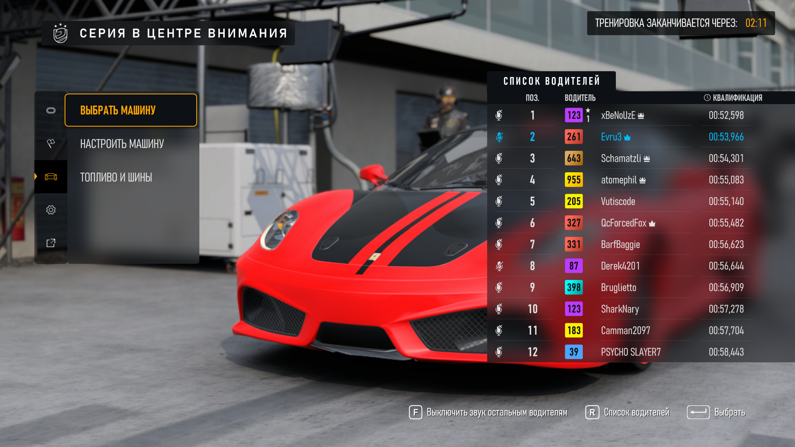 Вон глянь, на Ф430 во всех квалах на трассах практически в тройке, но есть и маньяки, нужно конфиг залить на некоторые трассы другой. С предпоследнего места, квалу прощелкал, но приехал также высоко, +12 мест )