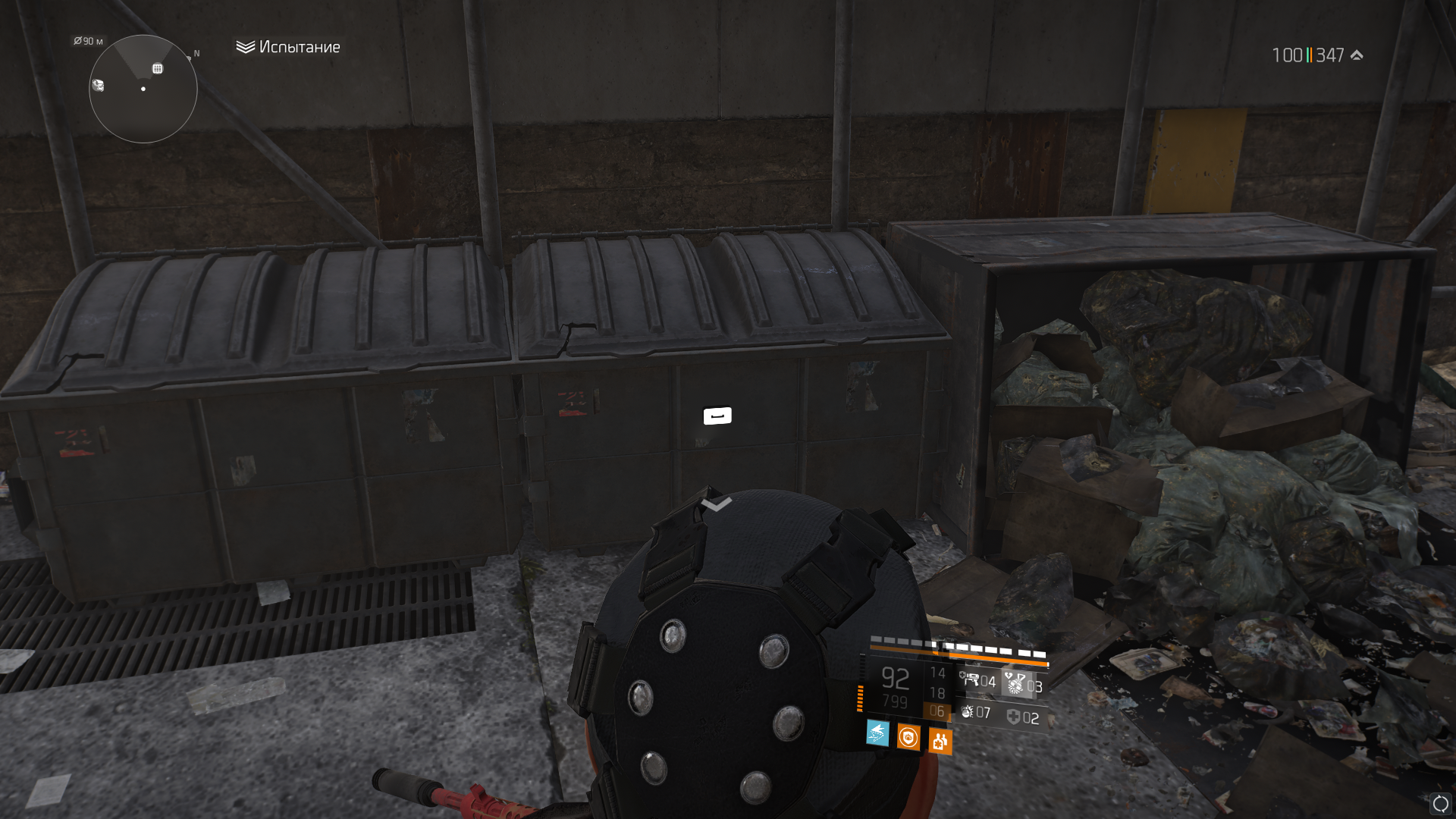 Возможно, этот средний мусорный контейнер под площадкой, где лежит этот телефон. Т.е. залезть на него, включить "идти шагом", и стрейфиться в сторону и одновременно жать "подобрать", и ещё смотреть в определённую сторону, на телефон, наверно. Я попробовать не могу, у меня подобран Делал ликвидацию в этой локации, кран не активировался.
