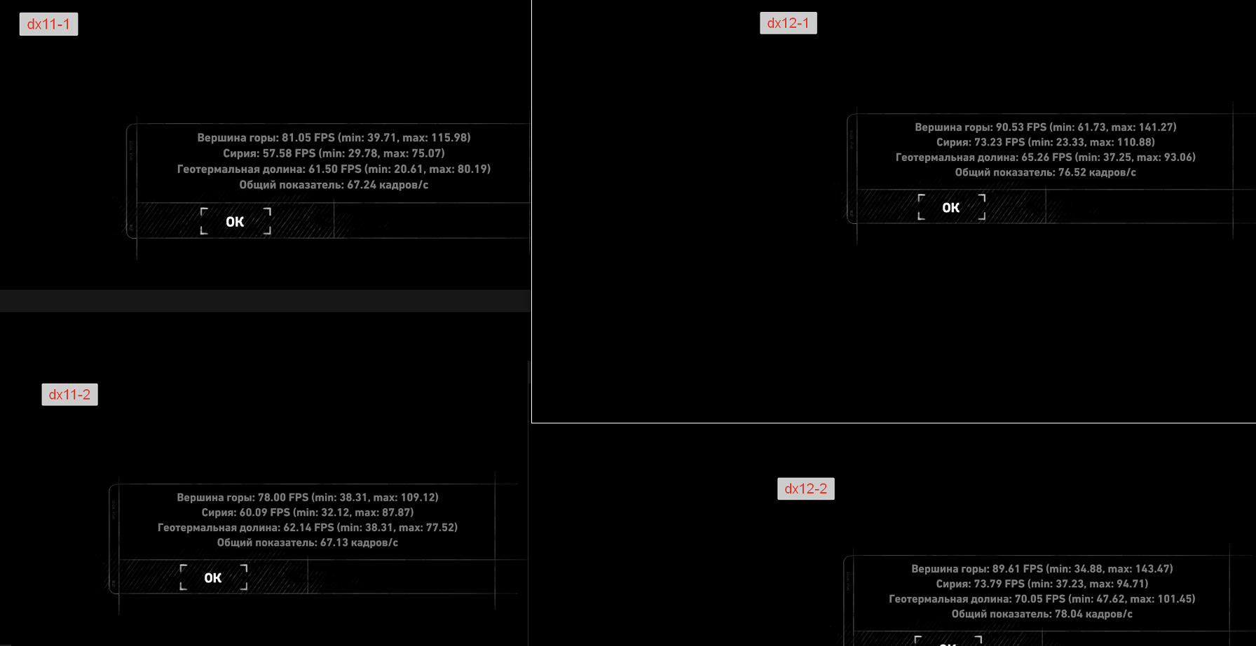Когда года ~2 назад играл, то от DX12 толка не было на GTX 1060 и даже наоборот - фризы и падение FPS. Тут сегодня наткнулся на видео в ютубе (~полугодовой давности), где человек сравнивал на GTX 1050 Ti. У него получалось +10-15% к производительности. Я что-то не поверил, запустил по 2 прогона встроенный бенчмарк... и да, FPS подрос на те-же самые ~10-15%. Хотя не помню что-бы патчи выходили за последние года 2. Драйвера 456.71.
