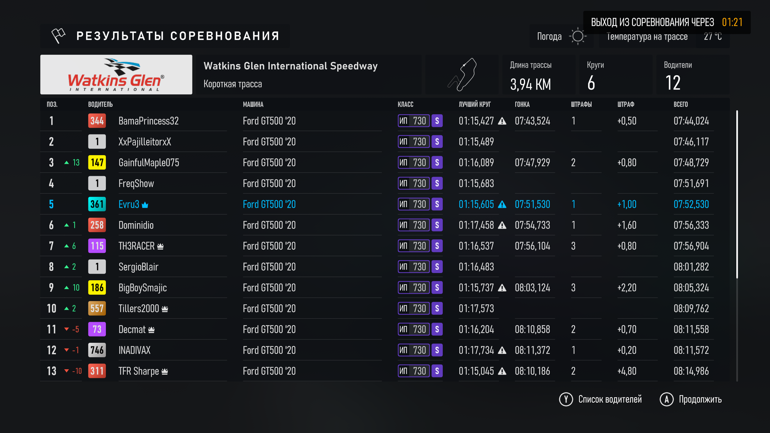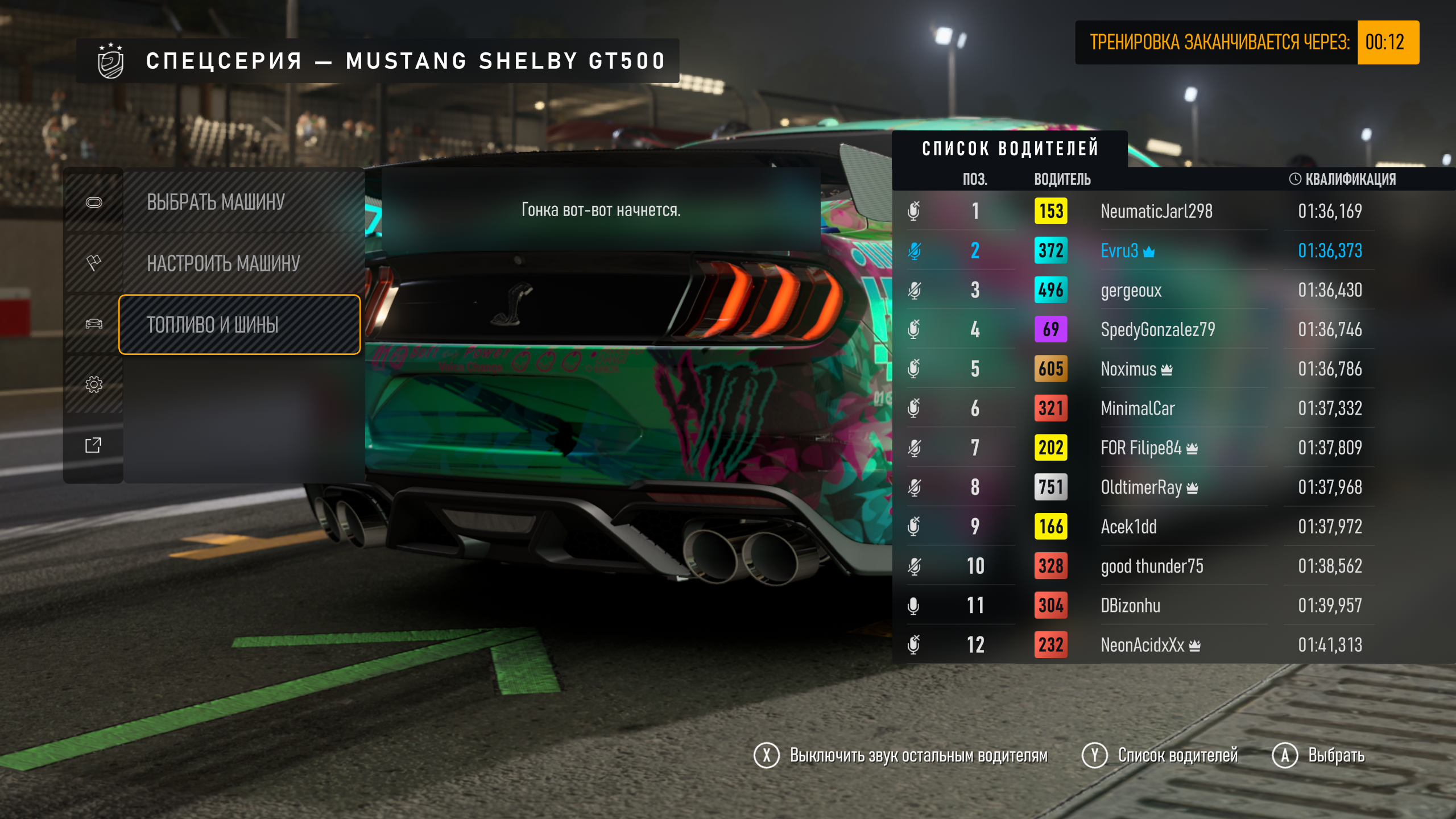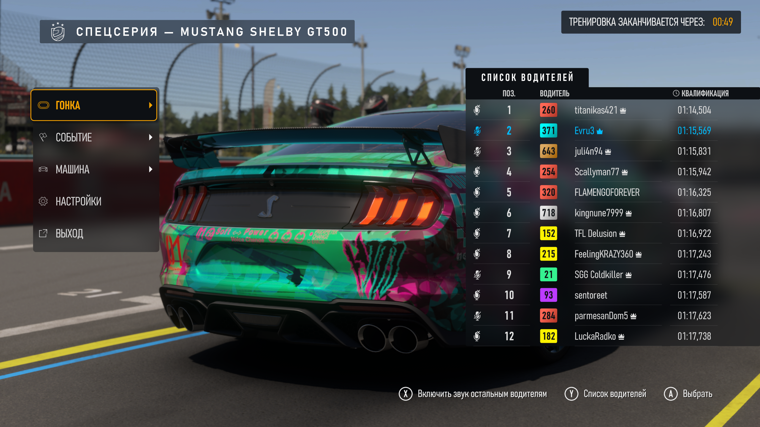 Ездят ребята вообще хорошо есть. Причем с небольшими званиями. Как и отчисляются из гонок, перед стартом, короче бардак творится, винегрет. Куча мола продолжается, развороты, через гонку, и это на S рейтинге безопасности. Не, онлайн тут пропащий. Я люблю ездить GT, симпатичные быстрые авто, 700-800 класса. Так и гонок таких мало, вот сейчас на Мустанге Шелби езжу, и толканья постоянные завалы, что за ублюдки я поражаюсь. Не могут аккуратно проехать первые два поворота, чтобы потом нормально погоняться, когда будет посвободнее, либо просто не могут ездить нифика.