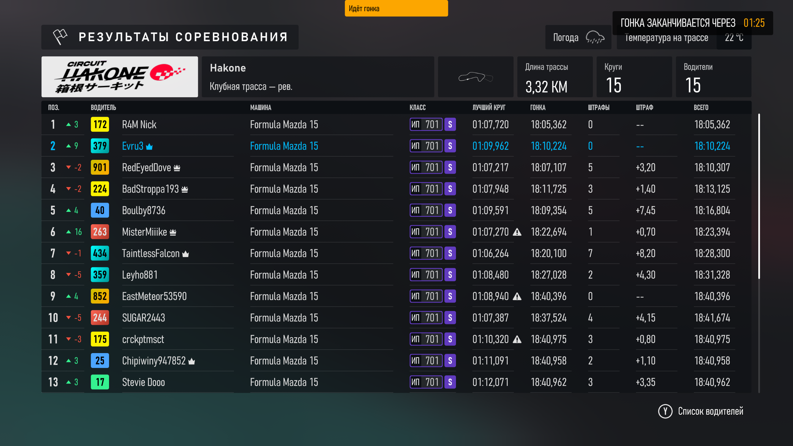 Ездят конечно, но если не читаки, или боты, либо может там с рулями задроты, то не сильно лучше. Вот потная катка была, машины одинаковые, в квале не напрягался, а в гонке показал лучшие круги даже быстрее. Но снова, как и последние дни, после первого поворота также одинаково пытались развернуть, и почти развернули, неск позиций потерял, уроды. (Это так люди на высоком S рейтинге ездят, сплошные штрафы и бортования, развороты. Не система штрафов, а говно).