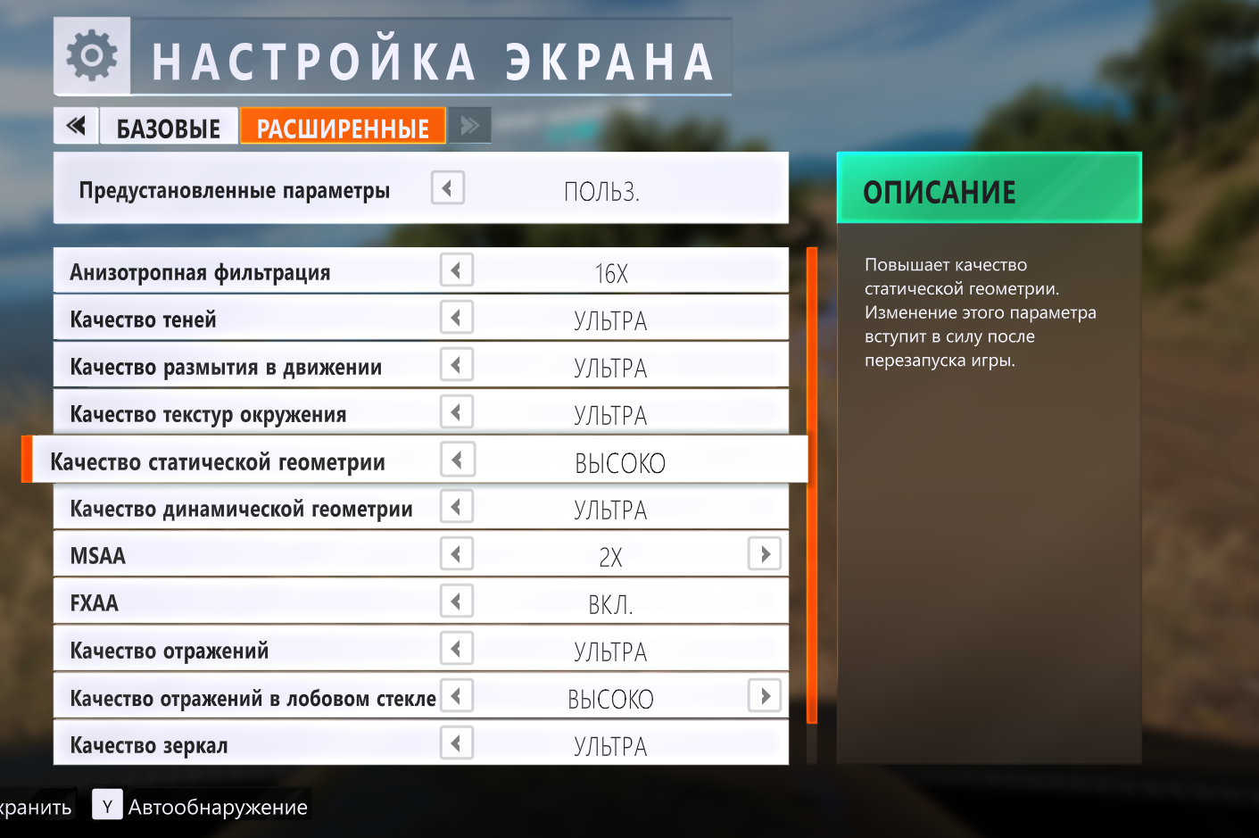 Дополнительные графические настройки (качество динамической геометрии и моделей авто теперь можно установить на минимум) We have also added some additional graphical options to improve framerate for those playing on lower specification PCs. These include: · Dynamic Geometry Quality now has a Very Low option · World Car Level of Detail now has a Very Low option These are combined with some existing options to create a new “Very Low” preset that can be used with dynamic optimization.