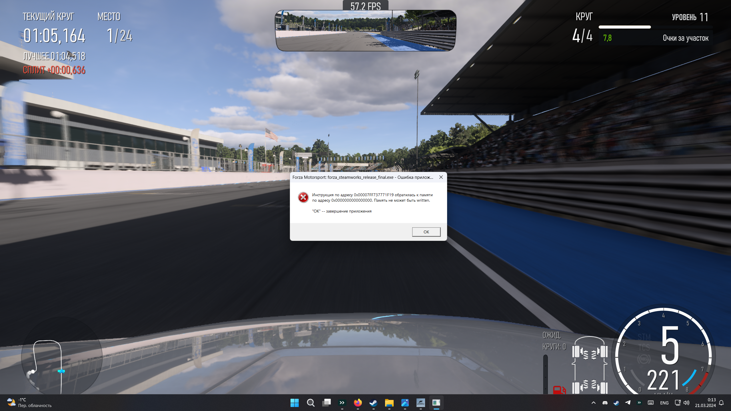 Повелся все таки на скидку Игра - кайф. Звук, графика, физика понравились. Играю на паде. После horizon 5 искал что-то посерьезнее. Но видимо рефанд, в сингле во введении где просят проехать по клубной трассе (тренировка 3 круга+гонка 4 круга) вылетает на финише с ошибкой. 5 раз попробовал. Даже попытался после онлайн заезда, в котором было всё стабильно. Проверку целостности файлов делал.