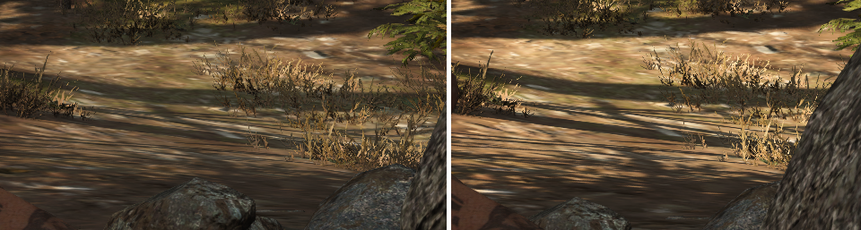 Даже увеличивать картинки не пришлось, разница сразу бросается в глаза (деревья, тени, камни), наверное и с RTX ты разницу не увидишь