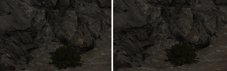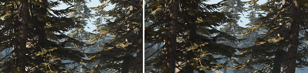 P.P.S. Вот сделал сравнение относительно дальнего обзора и опять не вижу существенной разницы, кроме разного положения тени от облаков на местности (чуть левее и чуть правее), что, по всей видимости, как и в предыдущем случае послужило отличием в освещении.