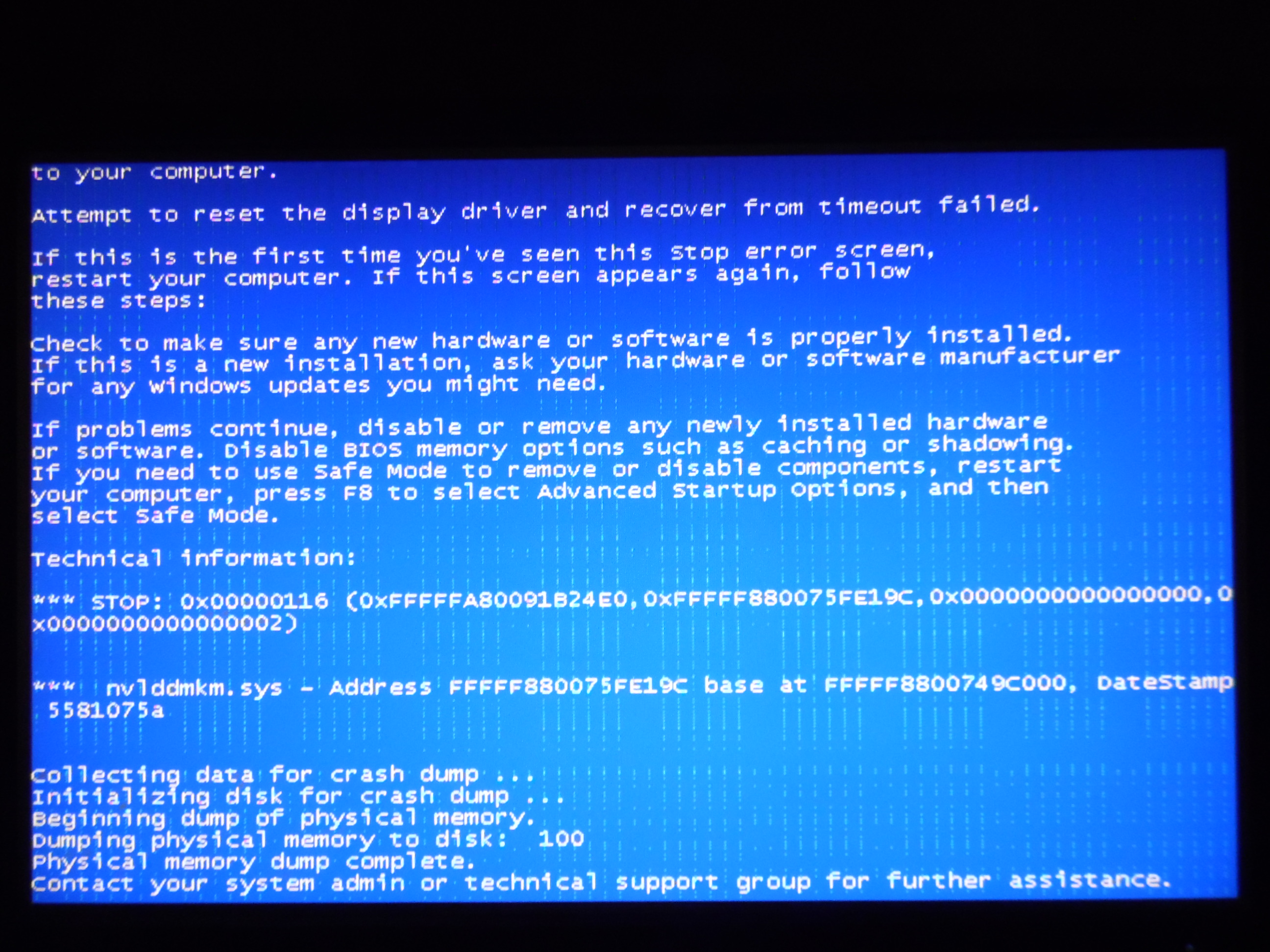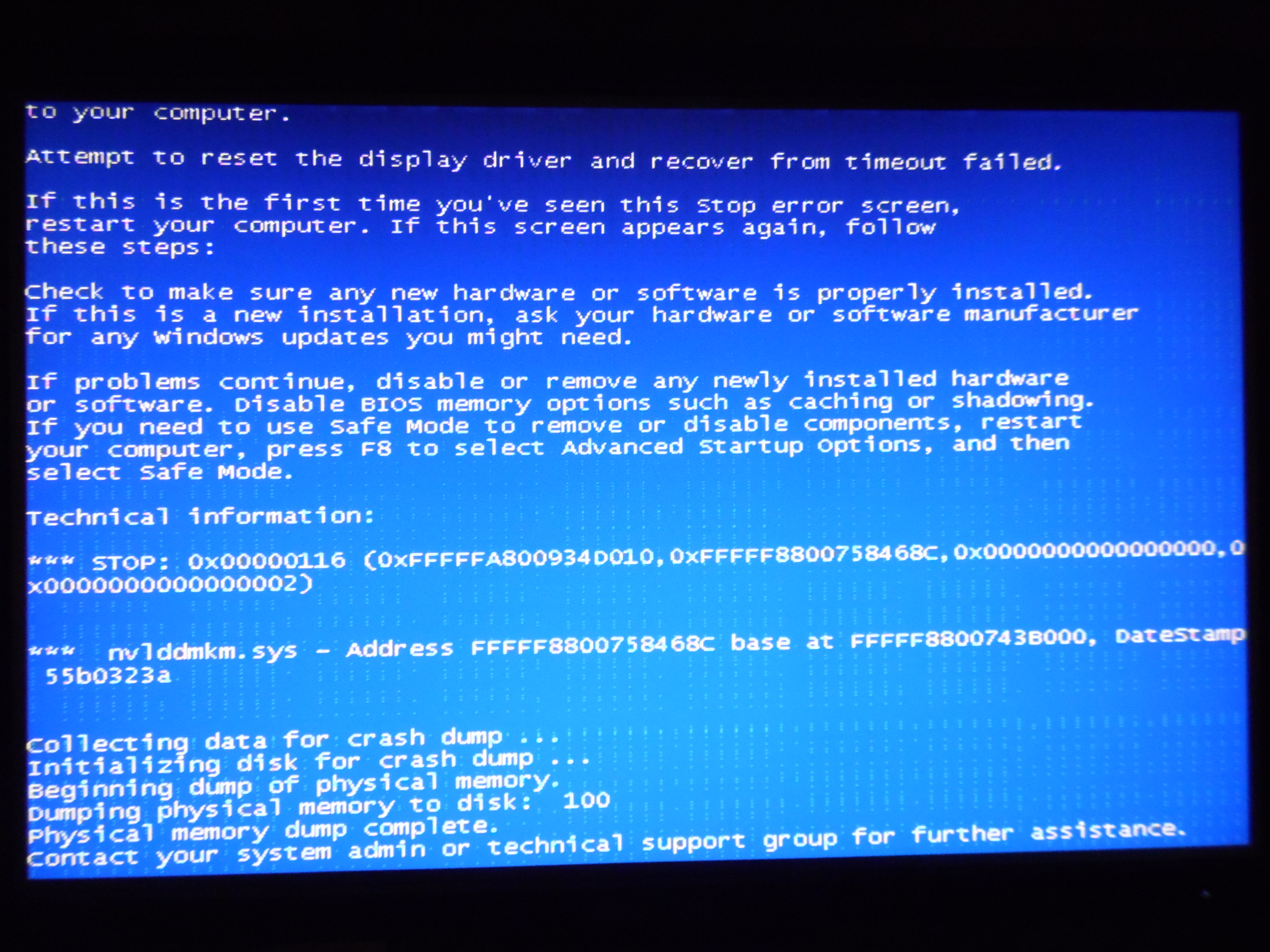 Добавлено спустя 53 минуты 40 секунд: А здесь http://bsodstop.ru/0x00000116-video-tdr-error другая расшифровка ошибки, больше похожая на правду: 0x00000116 указывает, что предпринята попытка сбросить драйвер дисплея и восстановить его, но при этом происходит превышение тайм-аута.