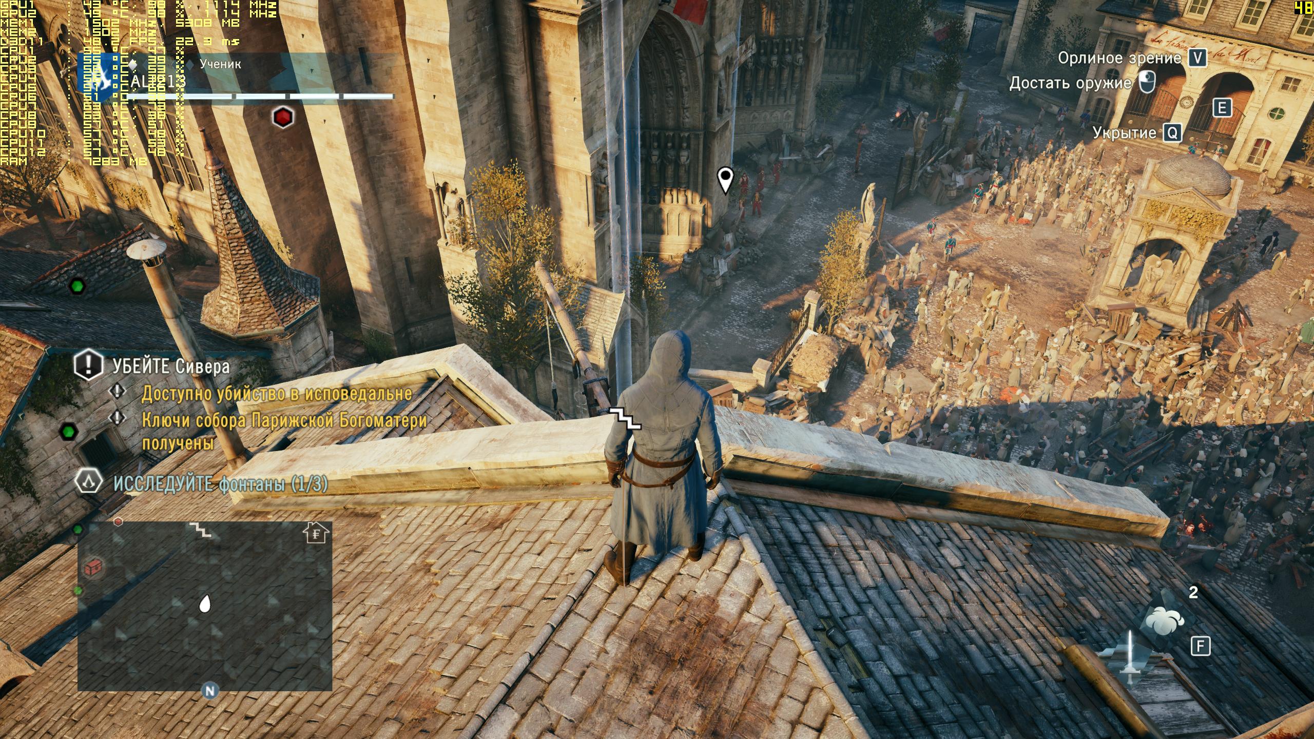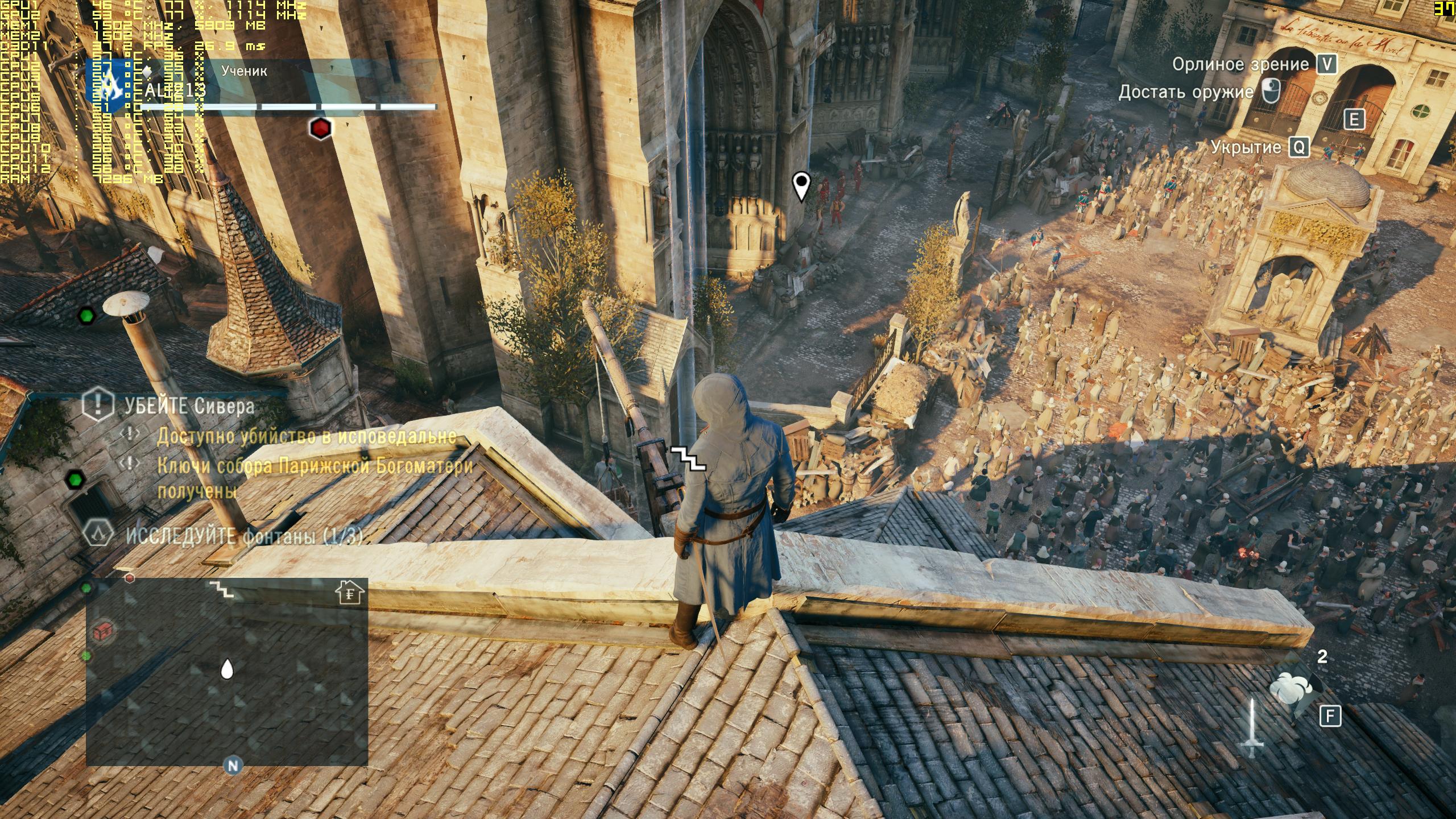 В целом полностью разочарован игрой. Ожидал не просто большего, а прям вообще !!!! особенно после WD. Если AC4BF превзошла все ожидания, то Unity - провал. В плане графики я не увидел той картинки, которой травили нас до выхода. TXAA как какой-то SMAAx2(или как его) из AC4BF. Разрешение текстур в Unity ниже чем в предыдущей части. Да прибавили людей. Только вот когда толпа делает одни и те же движения одновременно, напоминает старые футбольные игры FIFA, где размазанные по трибунам текстуры болельщиков двигались. А лица. Что с лицами у персонажей? Почему они пластмассовые? Анимация не доработана, привязка к объектам у персонажа хромает. Если через широкую улицу в AC4BF я прилетал в дверь на первом этаже, то в Unity я лечу в позе какающего туриста метров 10. А что сделали с боевой системой? Раньше было зрелищнее. Как можно убить кого-то промахнувшись по нему на полметра????? И таких косяков навалом! Мелкие фризы и баги на общем фоне провала незаметны.