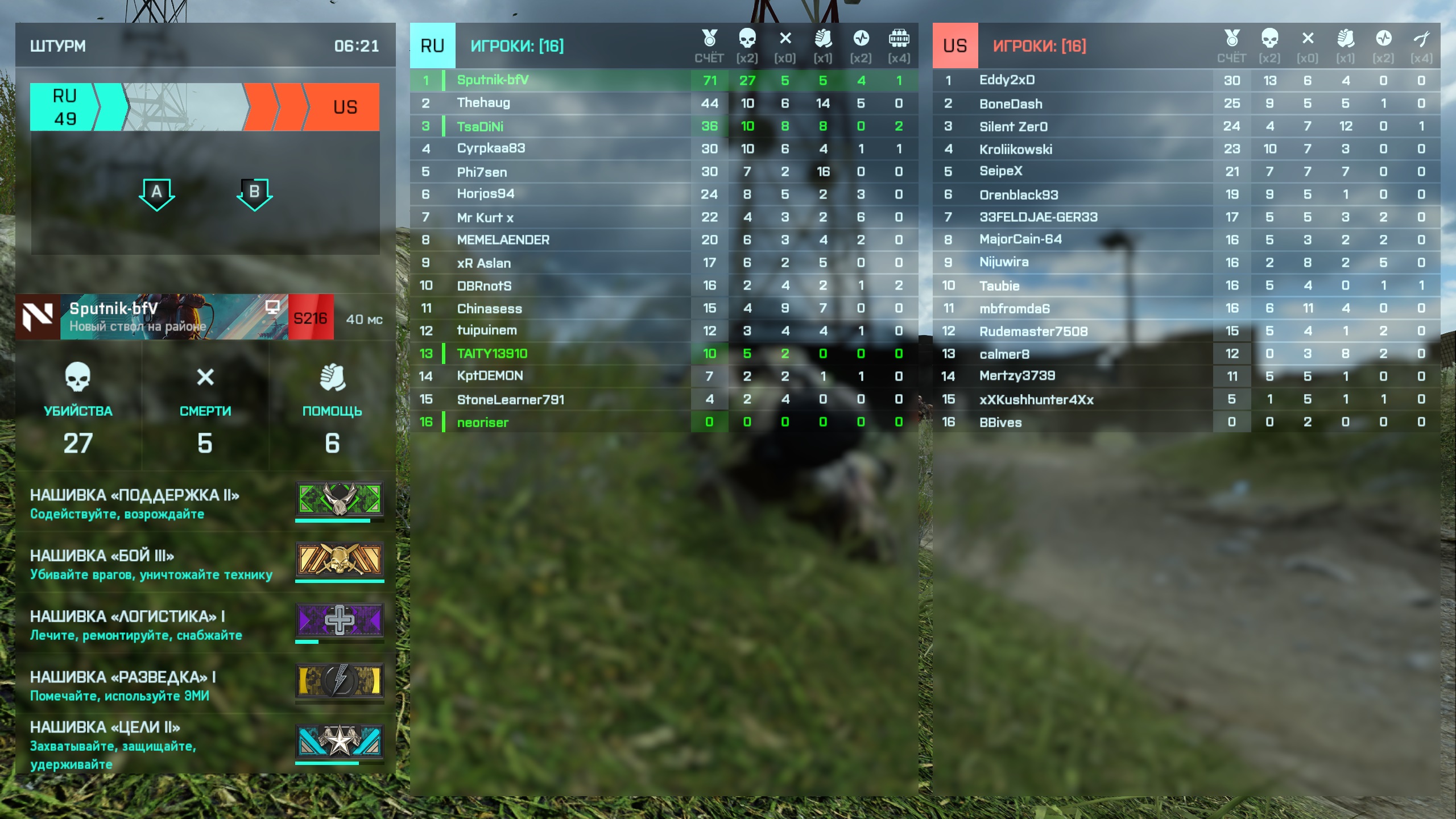 . Было 27/3, потом 2 раза я пушил точку 1 против 16, умер, и вышел. Помойные игроки портят игру не хуже самих дайсов.