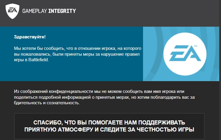 За время с момента выхода игры отправлял жалобы на более 20+ откровенных читерастов. Второй раз за эти почти полтора года пришло такое сообщение. Глядишь, лет через 10 остальных добанят