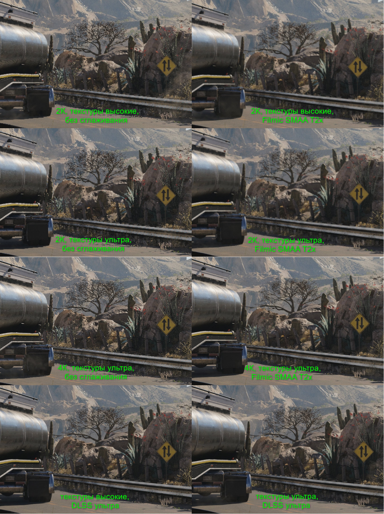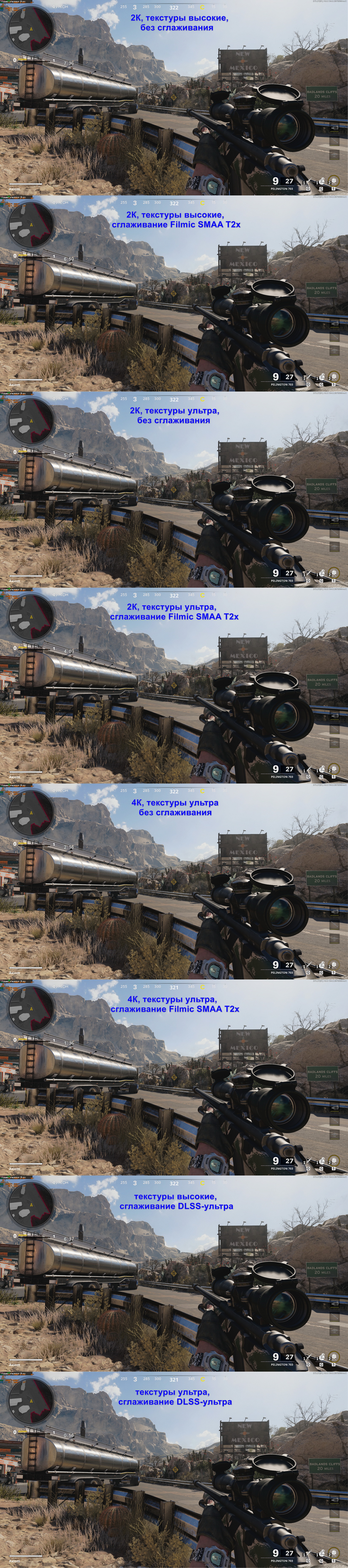 TECAK, DLSS я и не юзал - пользовался до сих пор Filmic SMAA T2x. А мыло без ультра-текстур получается только когда вплотную рассматриваешь поверхности (и то не все). В целом, если сравнить картинку у кого-нибудь, кто играет с разрешением FullHD, с моей в 2К - сомневаюсь, что моя даже без ультра-текстур будет менее чёткая. Сделал сравнительную выборку: зависимость fps от разрешения/качества текстур/сглаживания (на этот раз пришлось сильно ужимать, рассмотреть сложно - но можно ):