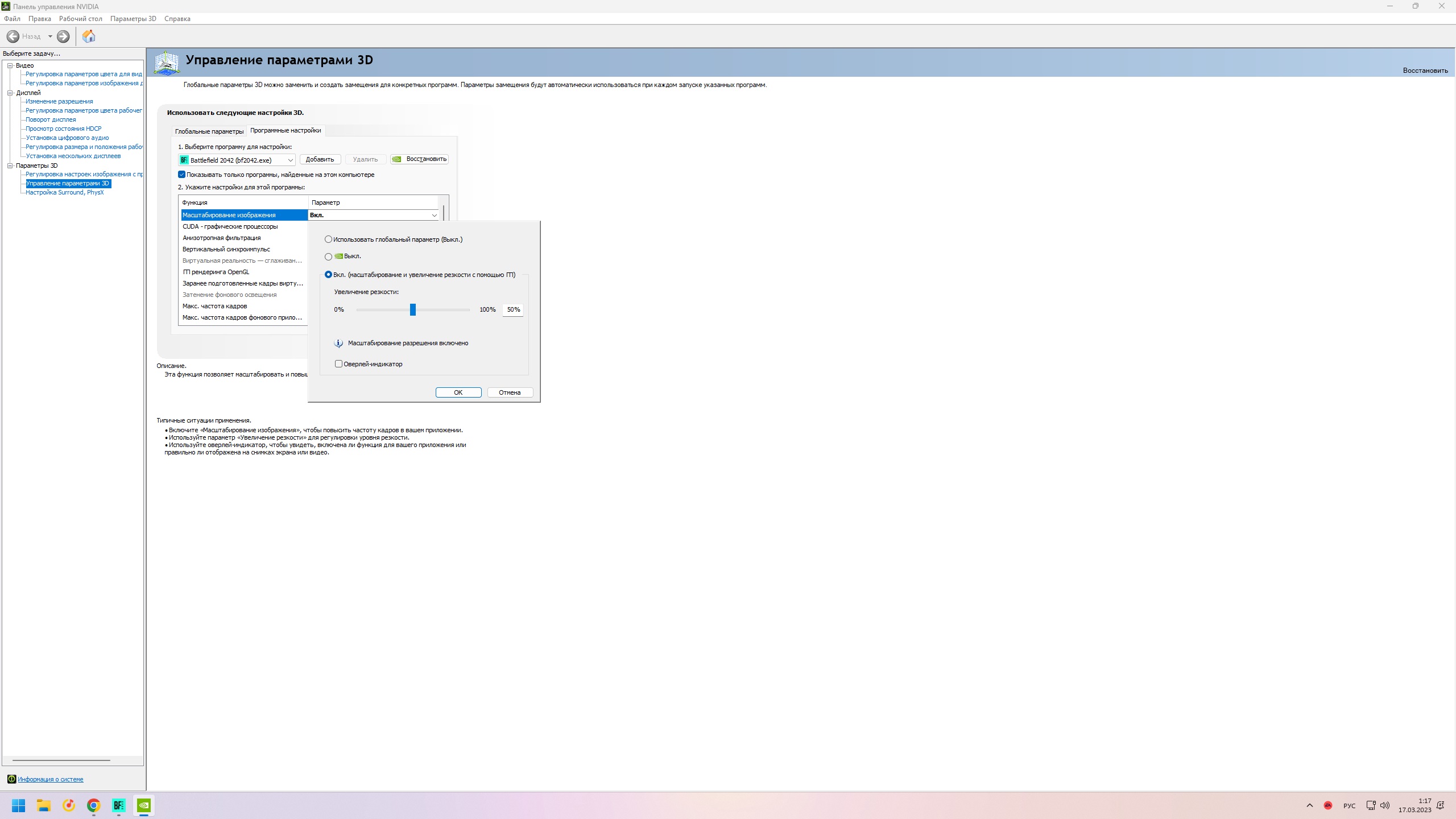 GhettoBird в панели слева выбери управление параметрами 3д. Далее, если хочешь увеличить резкость в конкретной игре, открой ыкладку "программные настройки", выбери бф2042, и там самый первый параметр "масштабирование изображения", "вкл", и там будет резкость.