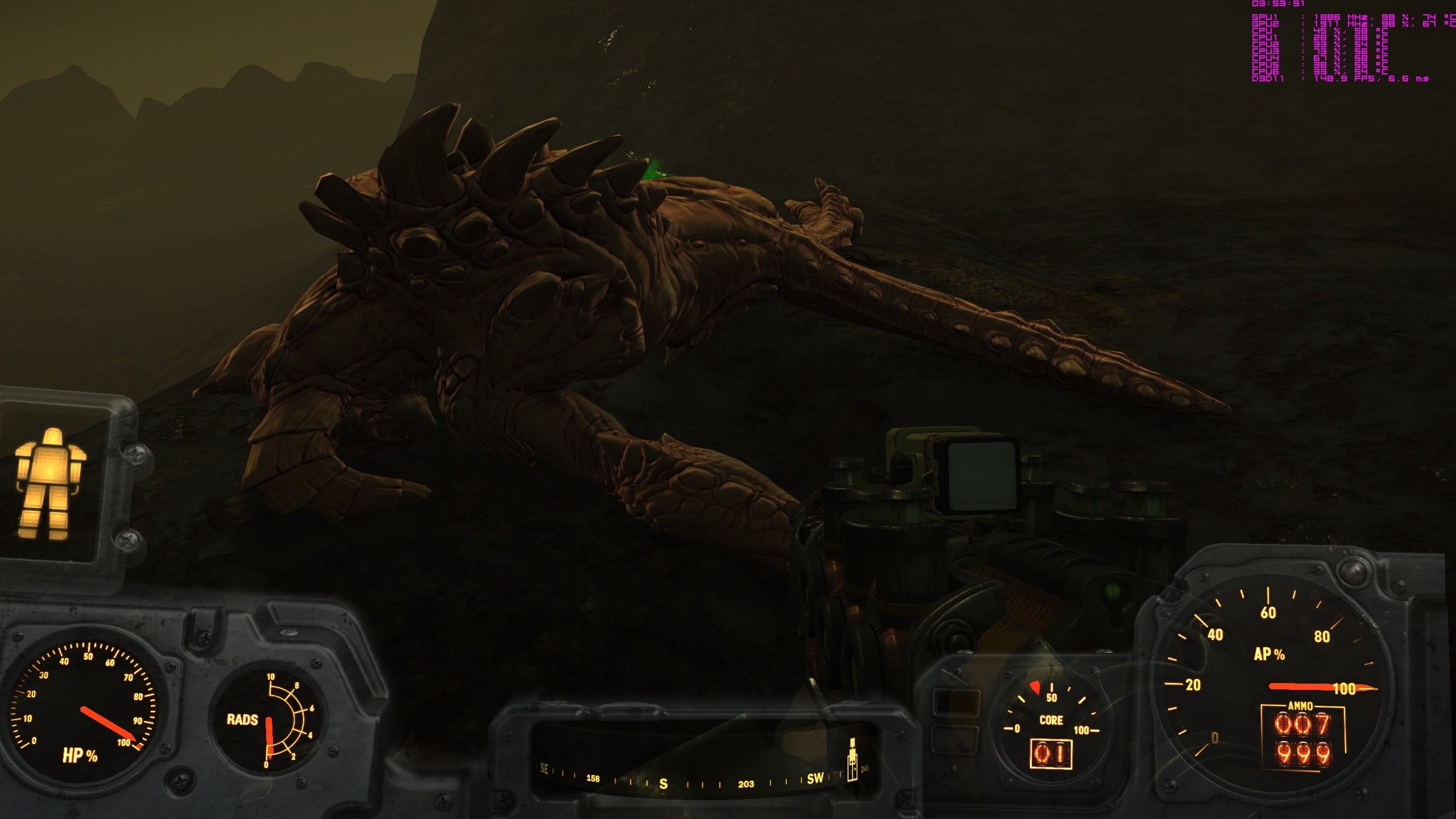 Ну, на двух 1080 можно и оставить, наверное. А так - ушатывалка фпс, особенно если включить фонарик пипбоя с тенями(модом включается). Можно еще поставить мод теней от лампочек в поселении. Включить пипбой с тенями рядом с теневыми лампочкаи воркшопа и начать стрелять. Интересно просадит ли до 20фпс?