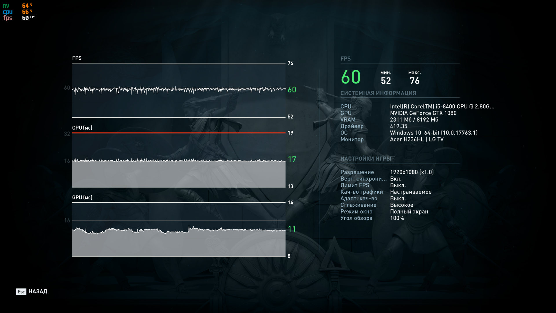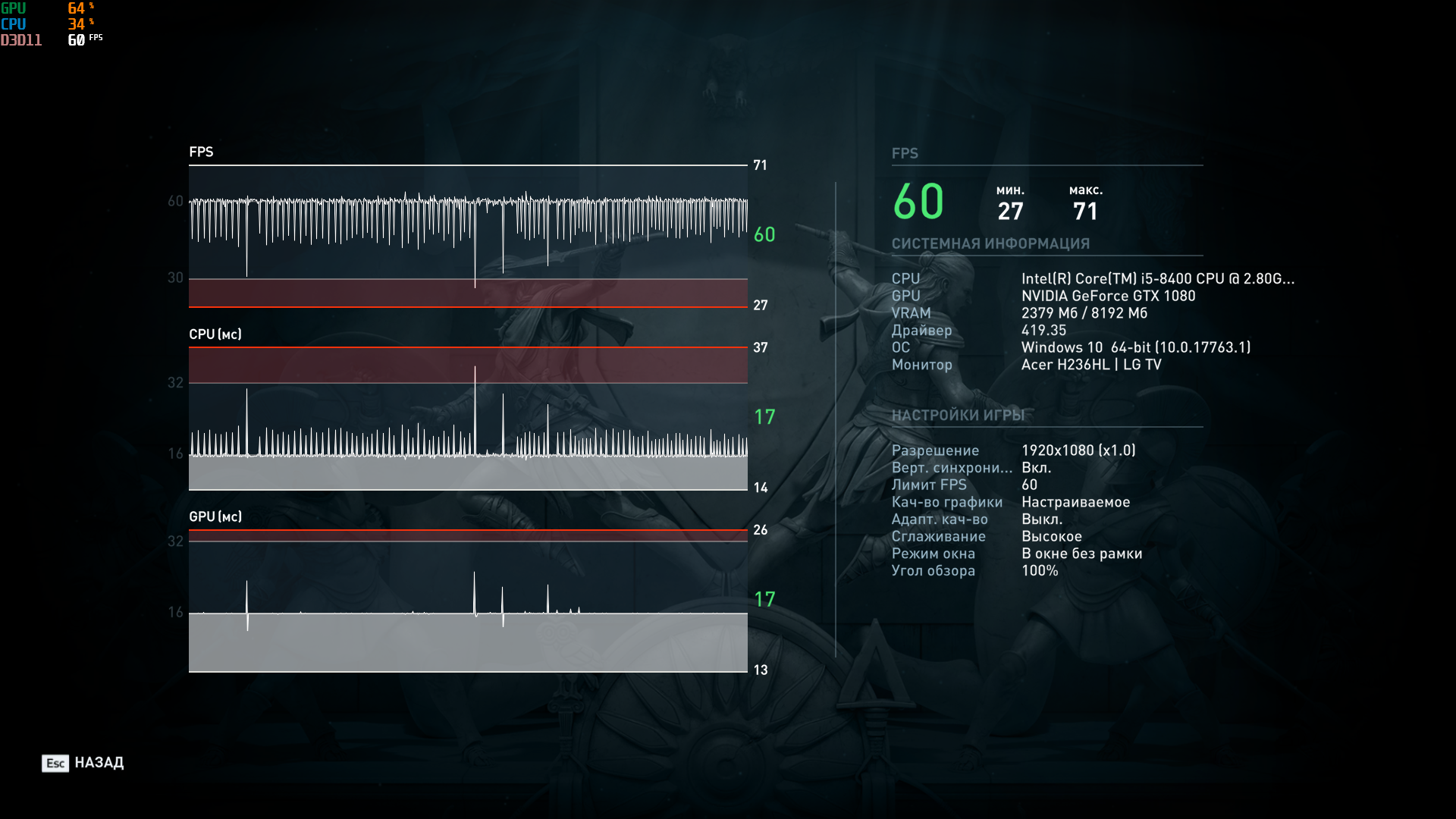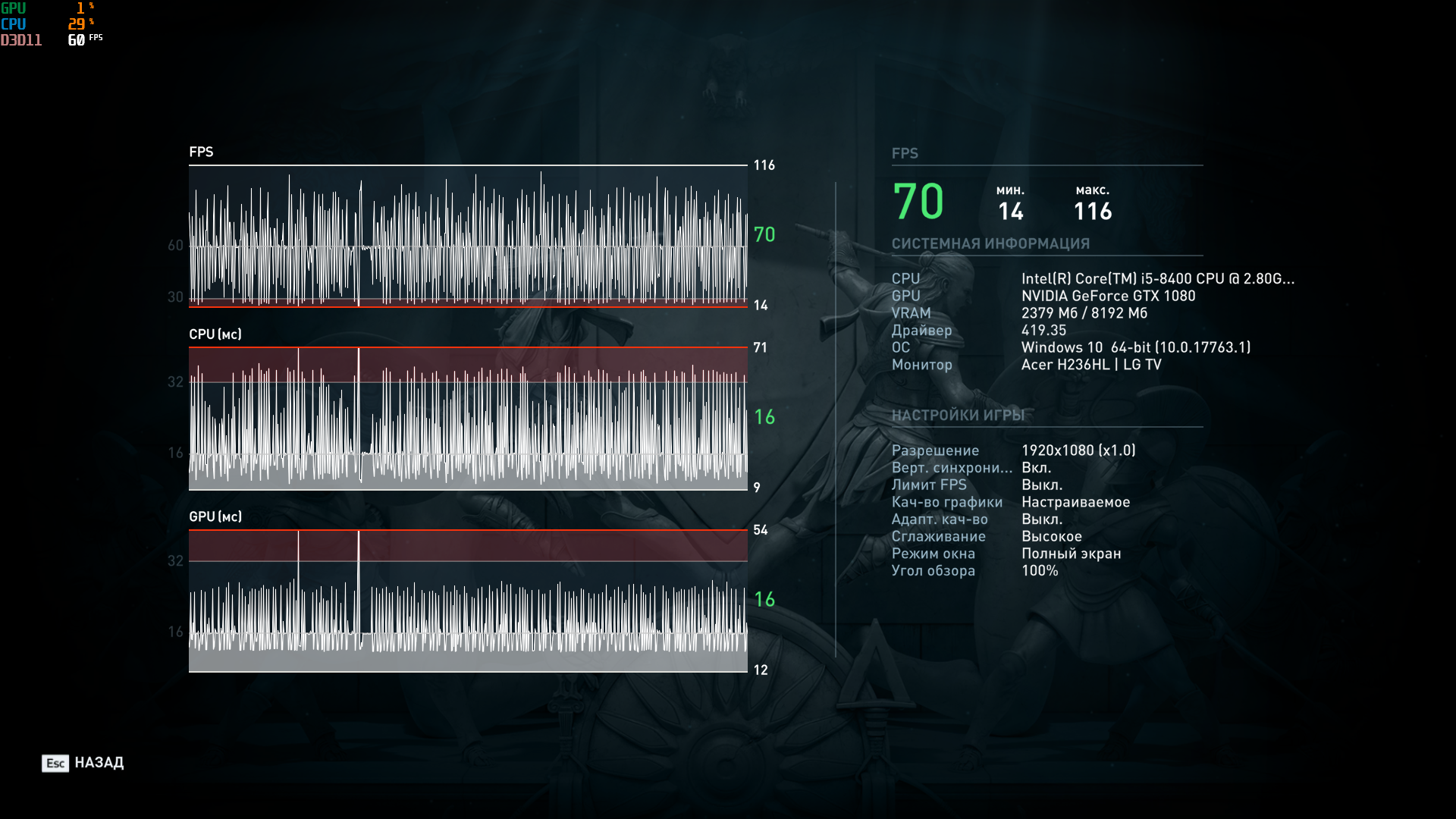 Пробовал именно так, фулл экран + галка "отключить оптимизацию во весь экран" на экзэшнике. (скрины 1 и 3) В окне без рамки это я для проверки просто посмотрел, тоже самое. Патч у меня тоже 1.1.4. У вас на скрине в игре не включена vsync, fps плавает. На G-Sync то тиринга нет понятное дело, можно без нее играть. Выключил vsync в игре, включил в драйверах, тоже самое. Проверил сейчас на уже пройденной Assassin's Creed Origins, Все нормально, стабильно 60fps.
