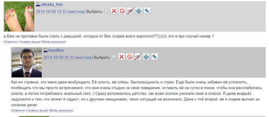 "Молодец Ленников! Так и надо поступать в таких случаях. Похоже, все эти девушки слишком сильно ценили свои вагины. Цены себе набивали или хотели попользоваться мужчиной. Своё и получили. Всё нормально и правильно. Если женщина идёт на романтическое свидание, то она должна быть как минимум не против секса с данным мужчиной. Иначе с какой стати она общается, пьёт и ест за его счёт? Надеюсь, так будут поступать все мужчины. Я бы сделал в таких ситуациях точно так же."