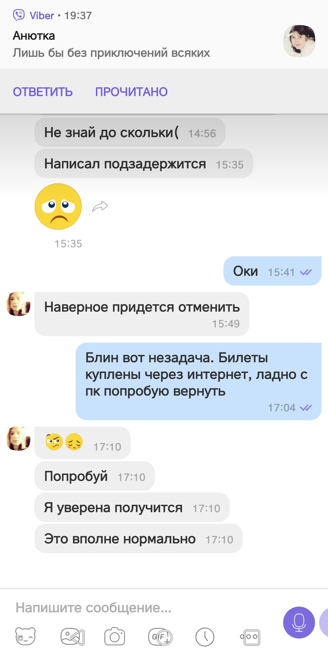 micros_83 Да, она обещала придти. А потом выяснилось, что бывший задерживается на работе и не может забрать 8 летнюю дочь. Билеты не получилось вернуть, а она даже не спросила все нормально ? Я обиделся и больше ей не пишу