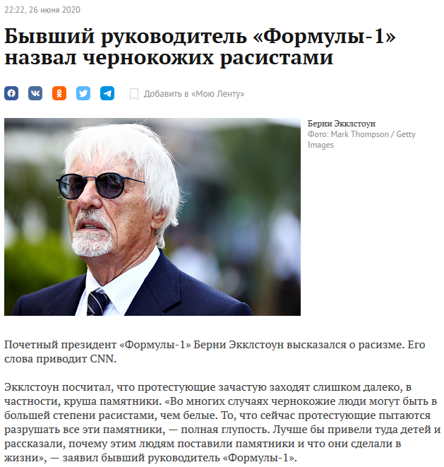 [quote]Люди должны хотя бы немного работать головой, и тогда они задумаются: "Что вообще происходит?…" Хотя по моим многолетним наблюдениям, часто бывает, что темнокожие – ещё более расисты, чем белые». Впрочем, привести какие-то конкретные примеры в подтверждение своих слов он не смог. При этом Экклстоун осудил стремление протестующих против проявлений расизма сносить памятники историческим деятелям (что, кстати, поддержал Хэмилтон), о которых известно, что они были носителями этой безусловно позорной идеологии. «Думаю, для начала этим людям надо пойти в школу, чтобы они росли, не думая о подобных вещах, – сказал Экклстоун. – По-моему, сносить статуи – совершенно глупая затея. Они должны остаться на своих местах. Их надо показывать школьникам и объяснять, почему они были установлены, что сделали эти люди, и в чём они были неправы»./quote]