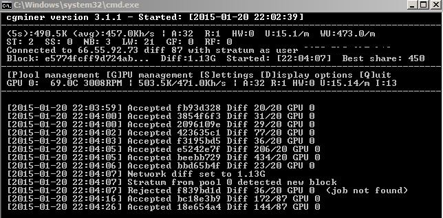 googayo 550 легко можно получить при 13 интенсивности, при более высокой 600+. для полной отдачи на 1 акк хватает где то 400-500 кхш. (поэтому имеет смысл занизить частоты и напряжения для меньшего нагрева) лучше старый добрый cgminer --worksize 256 --thread-concurrency 8192 --intensity 13 --lookup-gap 2 -g2 -d0 или 1