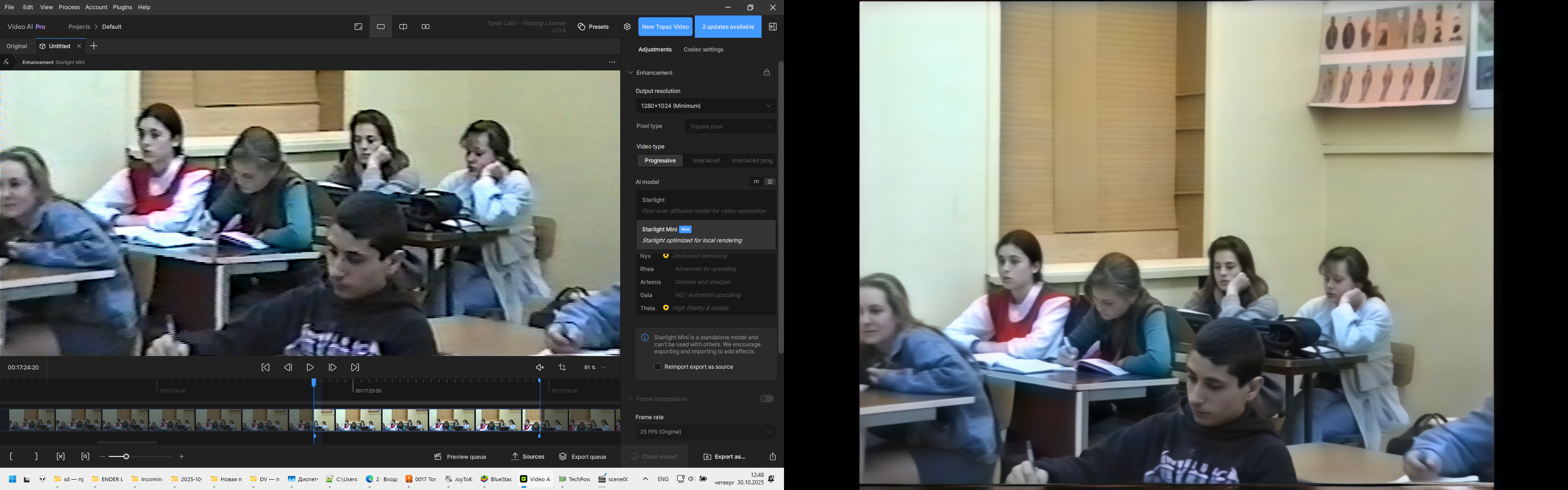 У меня есть все нужное (специально покупал в свое время RTX 3090 для локальных нейросеток, 24ГБ VRAM - для серьезных моделей надо много видеопамяти) и иногда запускаю эту прогу, чтобы глянуть прогресс ее разработки. Сейчас в топазе единственная норм модель это Старлайт Мини и как она улучшает например VHS запись можете глянуть на скрине. Моя 3090 задушена по поверлимит на 50% тк не люблю шум и температуру и в этом режиме VHS запись 1ч 40мин прога обещает преобразовать за 4 суток и 4 часа