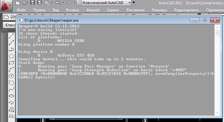 Добрый день! Решил параллельно с работой потиху майнить лайткоины. На данный момент майню на http://ltcmine.ru. Скачал Litecoin-qt, запустил прокси для пула, забил адрес, пароль и начал майнить на проце. Однако скорость в 15кхеш маловата Решил задействовать встроенную видюху, но никак не могу ее заставить работать. Reaper выкидывает ошибку,cgiminer тоже. Затык, как я понял, в CUDA.. нашел пока только RPCminer с поддержкой CUDA, но не могу настроить его (а возможно ли вообще?) на добычу лайткоинов. После запуска с параметрами