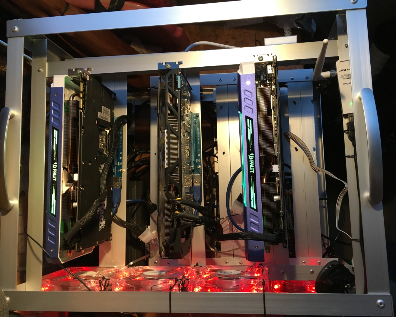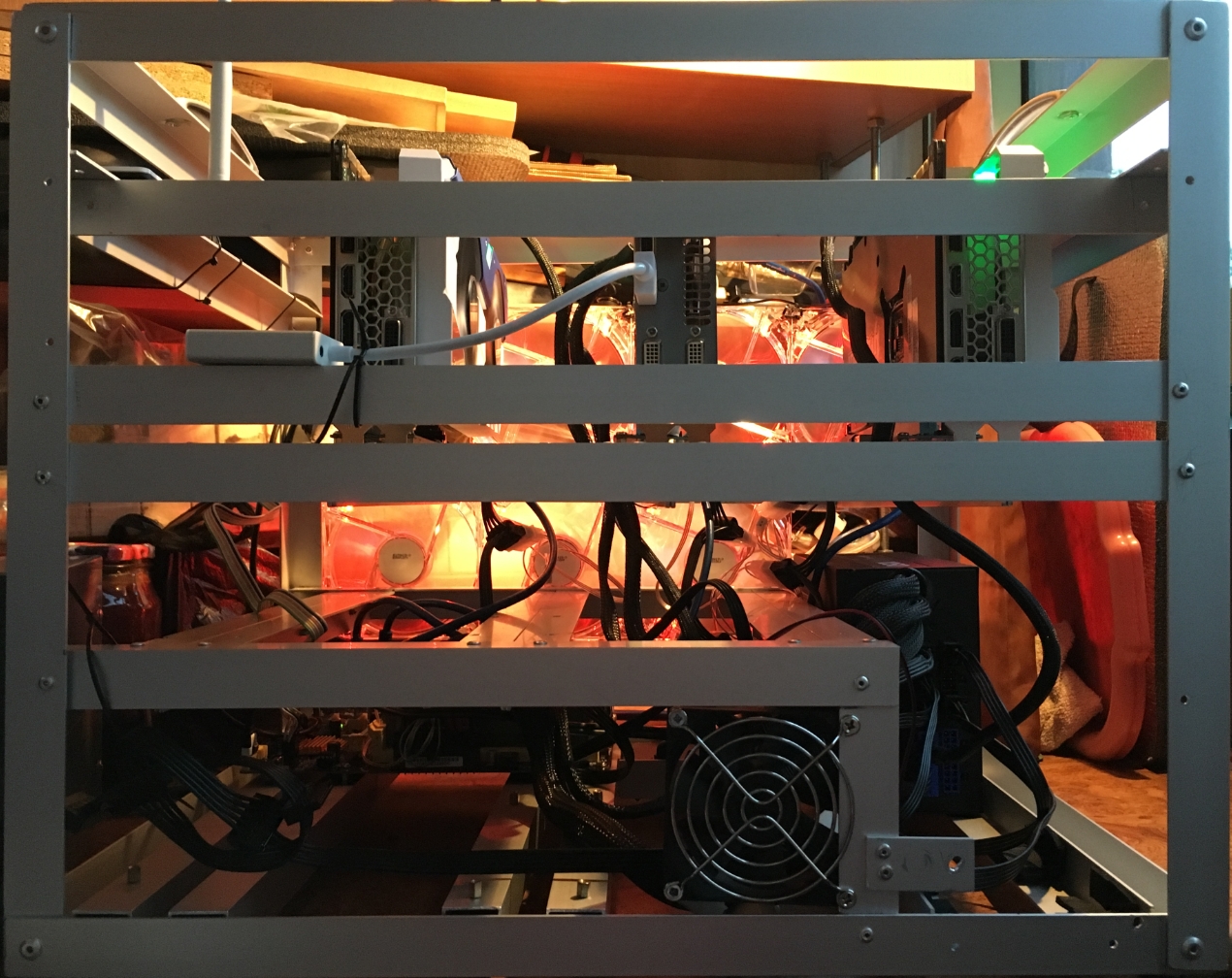 Стоит на застекленном балконе, пол дня на который светит солнце. Сегодня на улице +26, пол дня на балкон светило солнце, на балконе температура была точно выше 40 градусов, т.к. когда померил уже вечером было 37град., температура на картах выше 70 градусов не поднималась. На 1070 обороты 75% PL114, 270x обороты 45%. Короче я доволен Все комплектющие жестко зафиксированы, ничего не болтается, все по месту. И компактно! 500*400*400мм с учетом того, что ничего не торчит за пределы каркаса, кроме проводов! С отвеерстиями, конечно, много косяков, ну да пофиг, на скорость не влияет