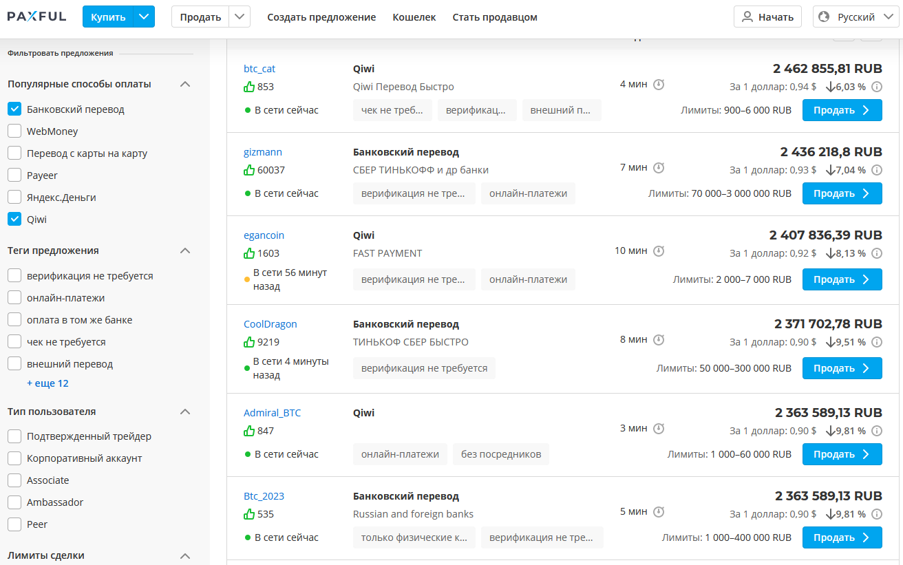 Если "ненадежные" включить, то прямо сейчас: paxful Внутренний банковский перевод СБЕР ТИНЬКОФФ и др банки 2 434 975,87 RUB binance - 2,521,874 -?% ебит Last: 2428000.00 -9%