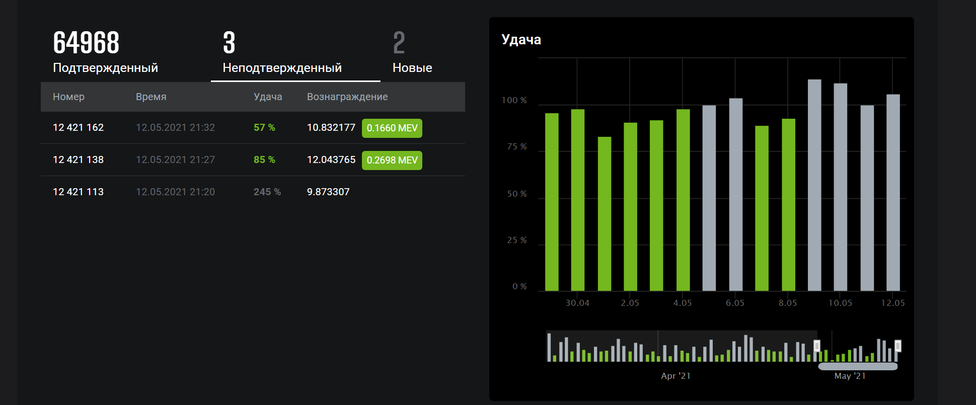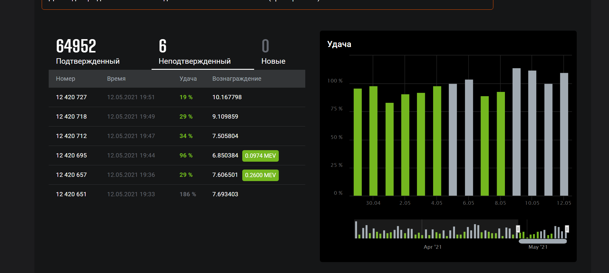 An incident with our share validation engine caused shares to be rejected for ~30 minutes. As compensation, the mining and MEV fees on Ethermine will be lowered to 0% for 48 hours starting from the 12th of May 2021 15:30 UTC. Please accept our appologies for this incident & thank you for mining with us.