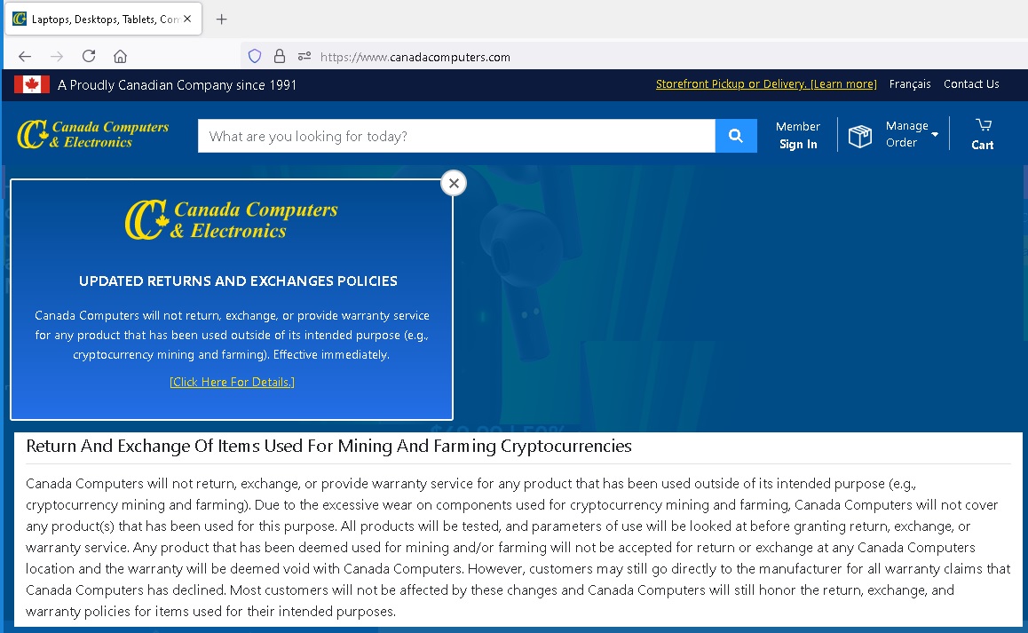 Canada Computers не будет возвращать, обменивать или предоставлять гарантийное обслуживание .... (например, майнинг и фермерство криптовалюты).