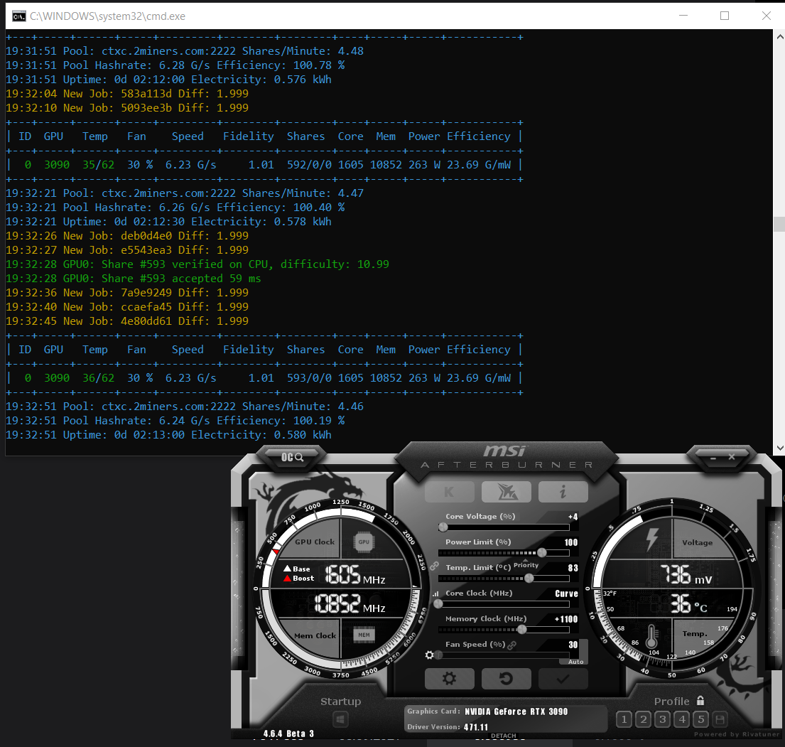 Пока так для 3090. Калькуляторы показывают теоретическую скорость 6,55 для 3090. На скрине плюс-минус стабильная частота для данного напряжения, выше по частоте просит выше напряжение.