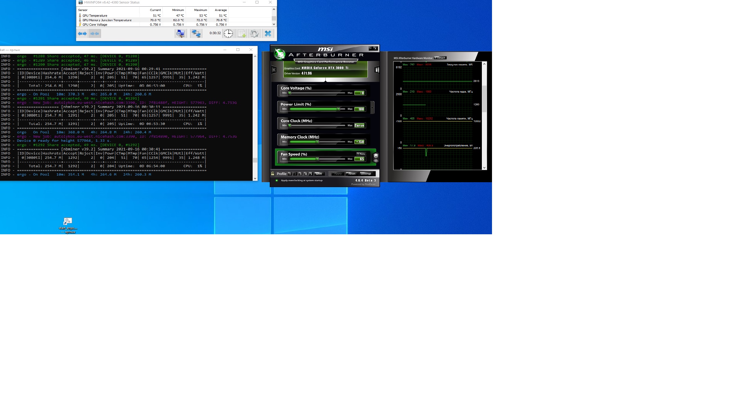 nag77 А вот и не ровно кефиру .если про лох идишен 3080 TI ) Скрин не удачный мой, но профит выше чем на скрине. 256 хещей на тихе моей с андервольтом , тихо и холодно и память отдыхает 207 ват-предел можно еще опустить частоту , но тогда ютуб сильно хеши сажает )). Тапка в пол в майненге не мой случай , пол бакса не стоит 30% жора.